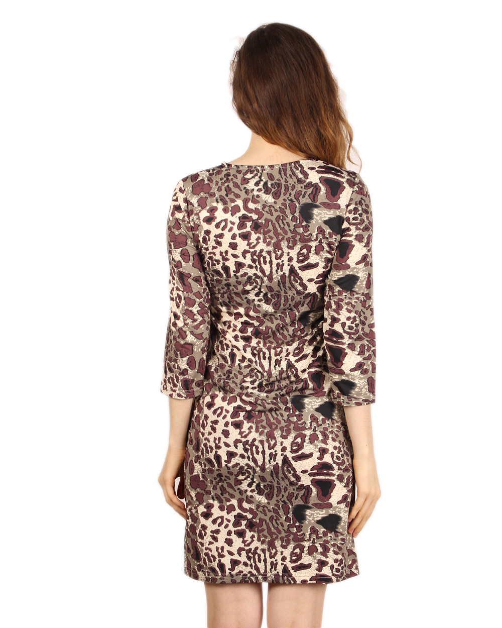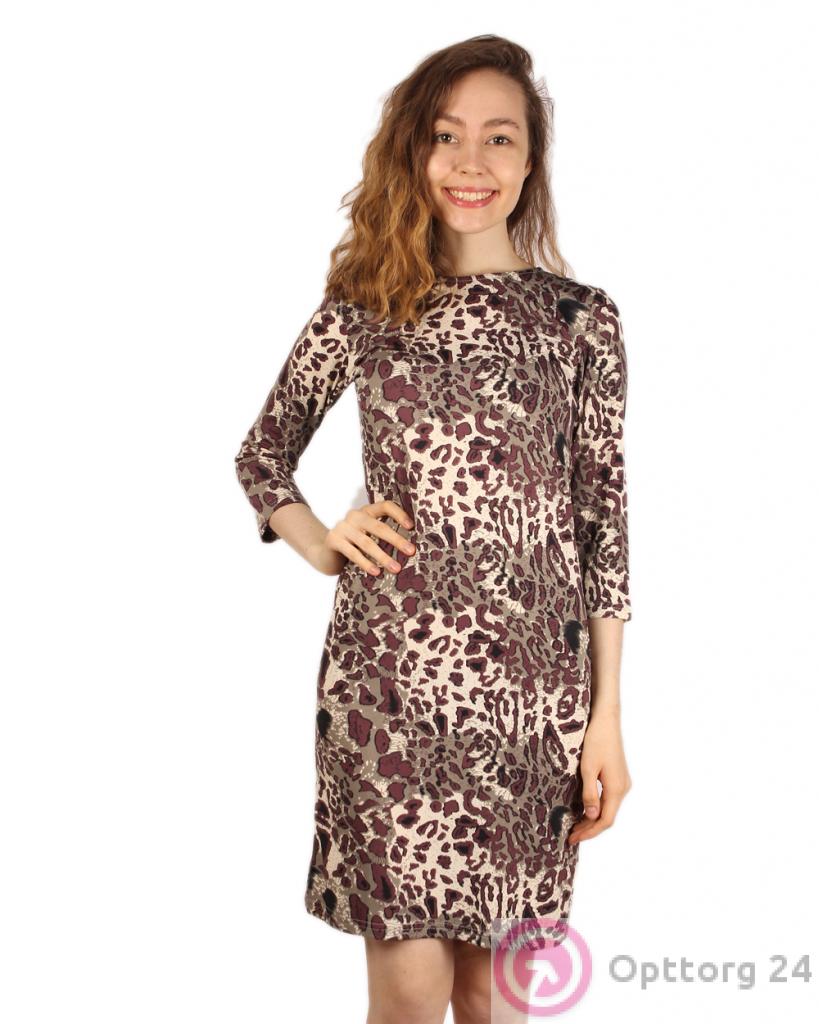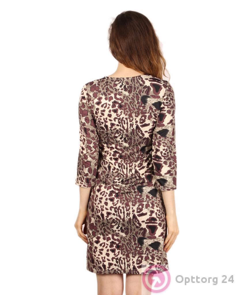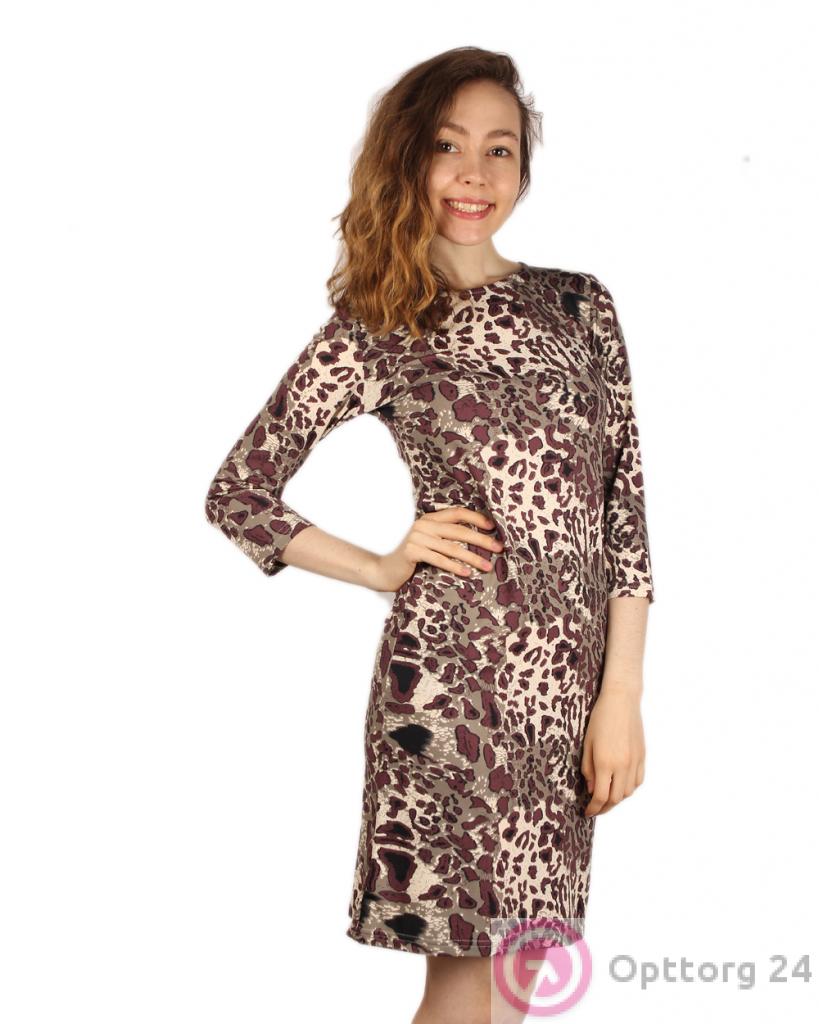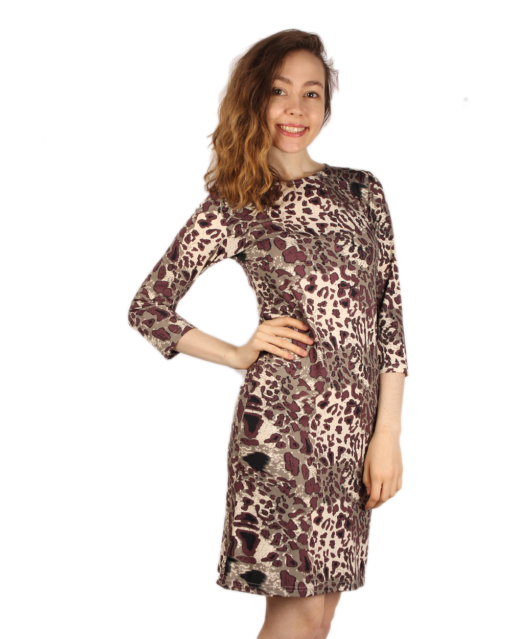 Стильное платье-чулок с анималистичеким принтом бежево-фиолетовое. Платье хорошо тянеться, красиво ложиться по фигуре. Небольшая округлая горловинка, рукав 3/4. Универсальная длина платья - до колен, позволяет носить его на работу, на деловую встречу или вечеринку.