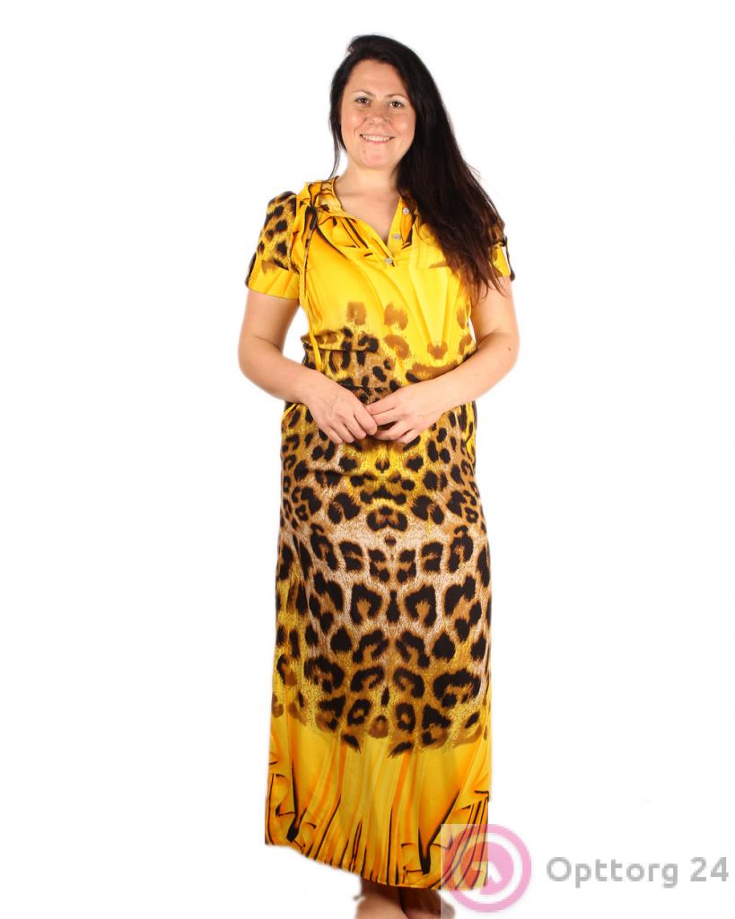 Платье длинное с капюшоном желтого цвета с анималистическим принтом оптом