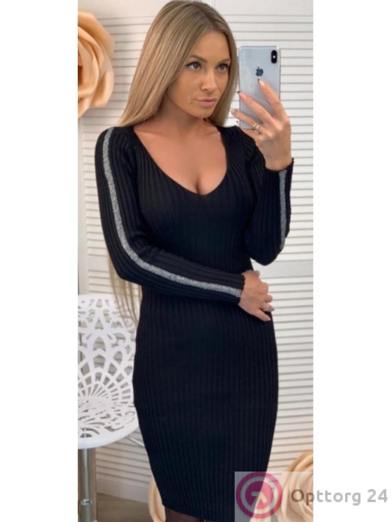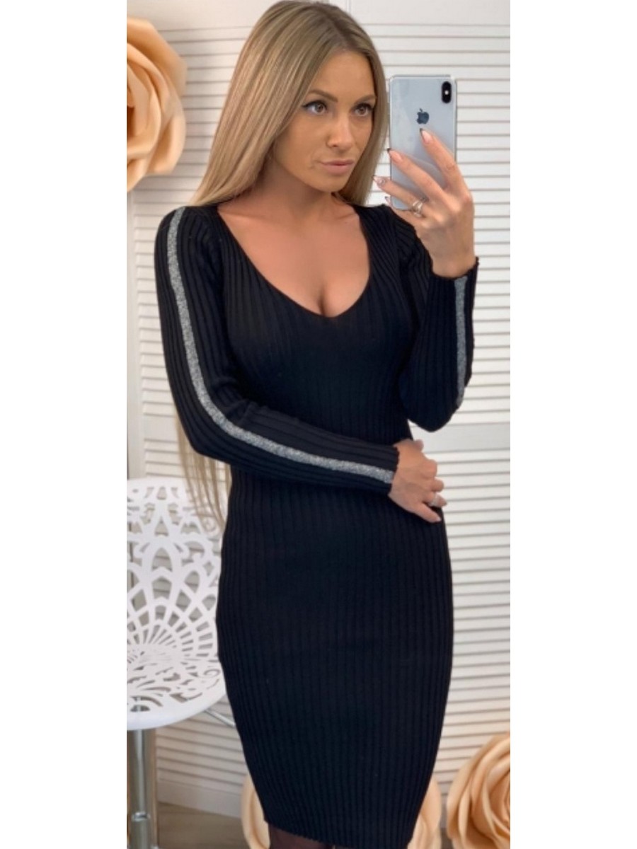 Черное вязаное платье для женщин, на рукавах - вертикальные серебристые полосы. Облегающая модель.