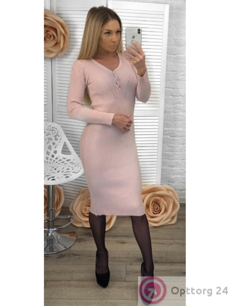 Женское вязаное платье розового цвета, длинные рукава и глубокий вырез, декорированный металлическими кнопками. Длина до колена.