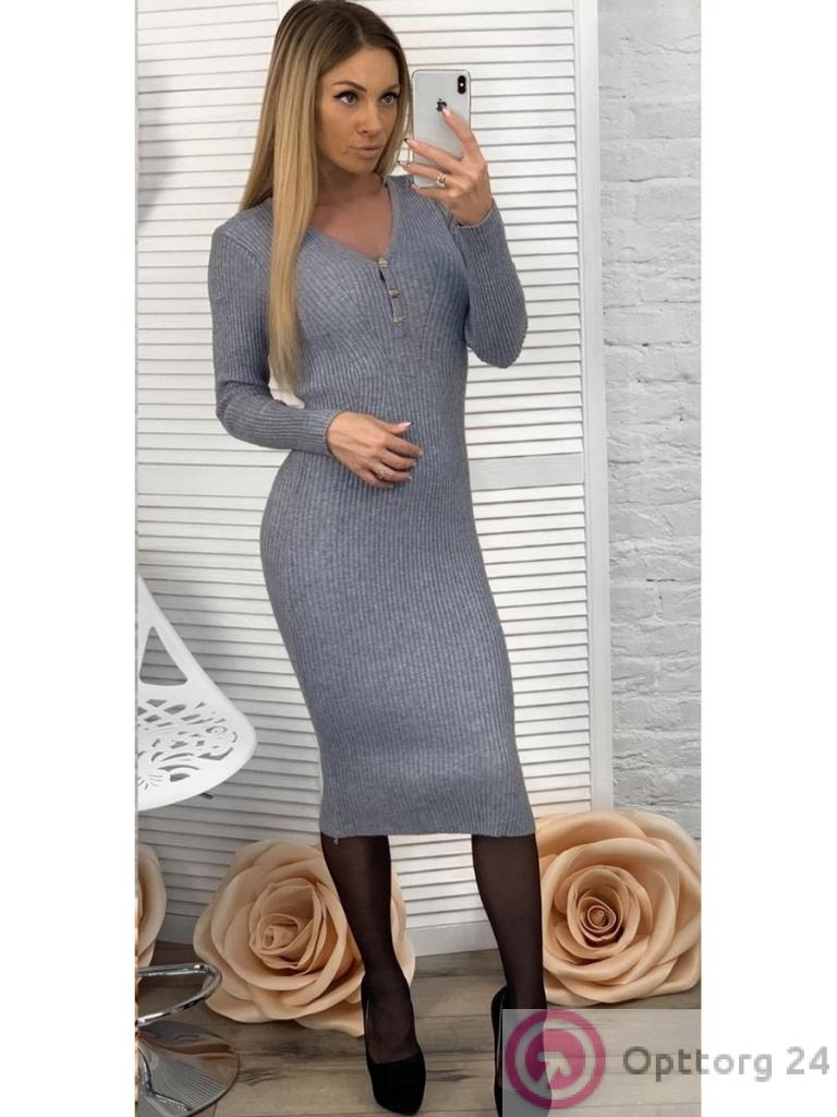 Серое вязаное платье для женщин с глубоким вырезом на металлических кнопках. Длина до колена.