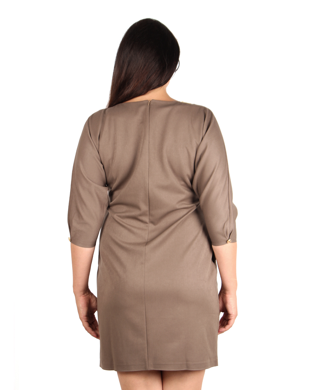 Платье футляр бежевого цвета с цельнокройными рукавами и выточкой на груди. Украшение платья служит брошка из той же ткани, что и платье с золотистой окантовкой.