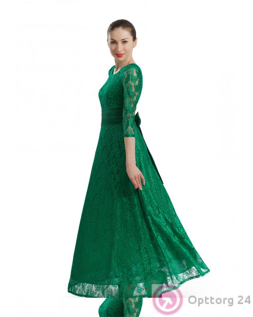Элегантное вечернее платье " в пол " из гипюра зеленого цвета с широким поясом, сзади завязывающийся в бант. Идеально подойдет для торжества!