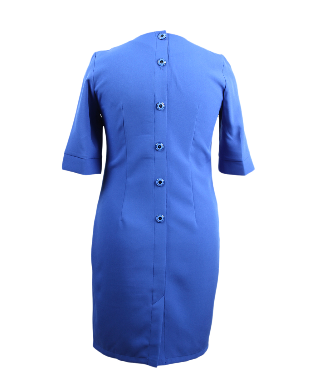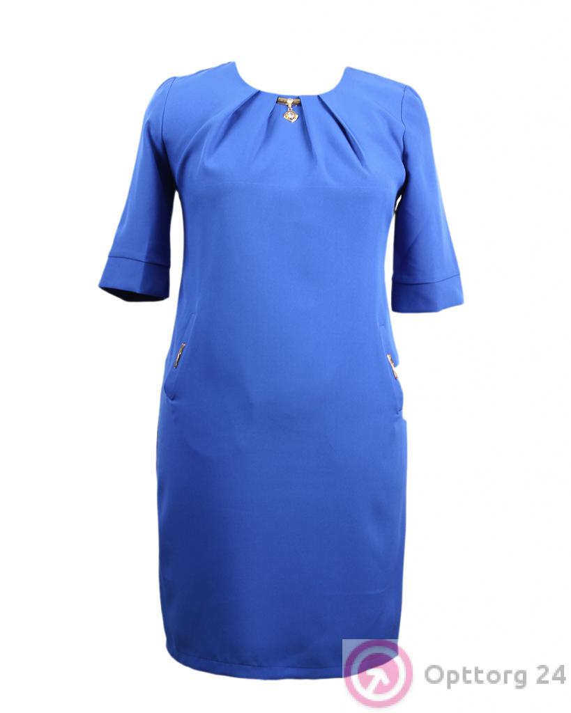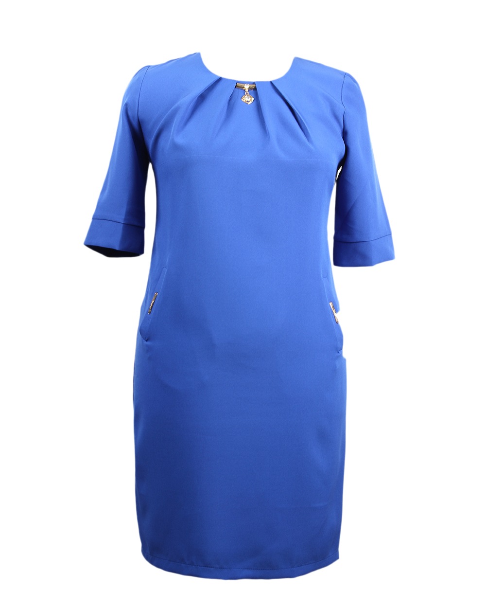 Однотонное денское платье приталенного кроя. Рукава короткие, длиной до локтя.