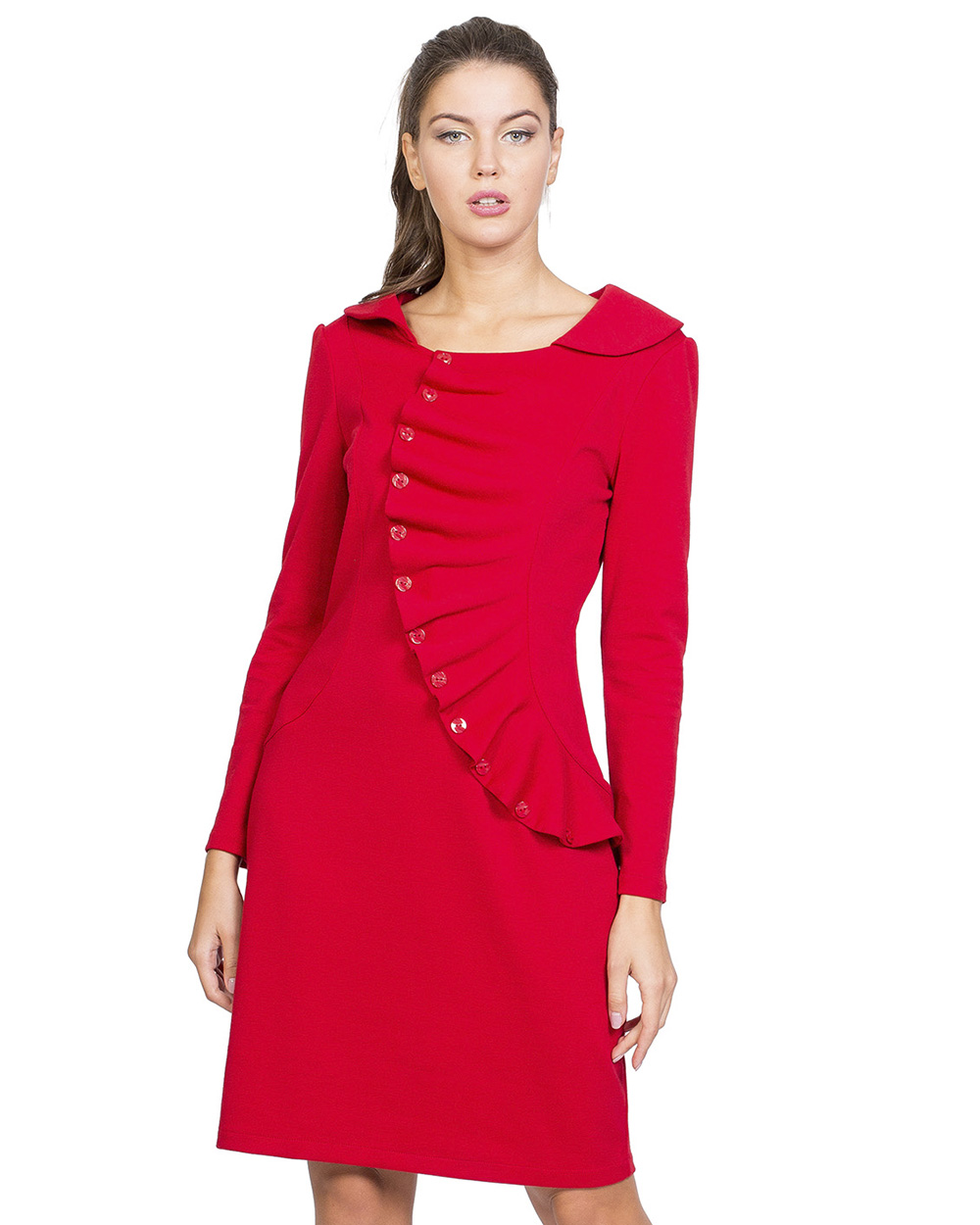 Элегантное платье гранатового цвета, на груди украшения в виде складок с пуговицами. Хорошо сочитаются с туфлями, в цвет платья, на высоком каблуке.