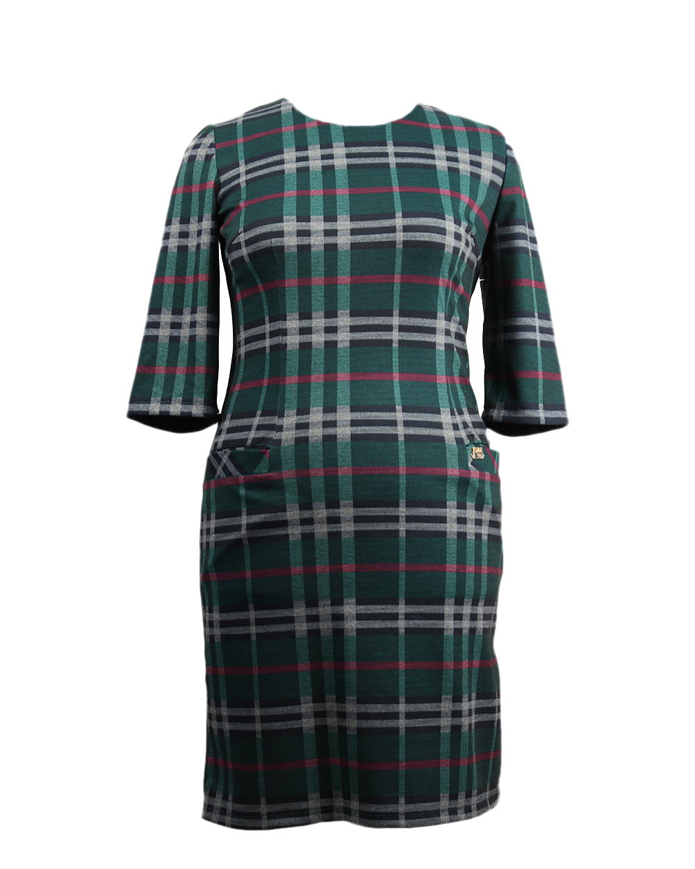 Строгое деловое платье с клетчатой раскраской. Модель имеет приталенный крой, имитацию карманов по-боках.