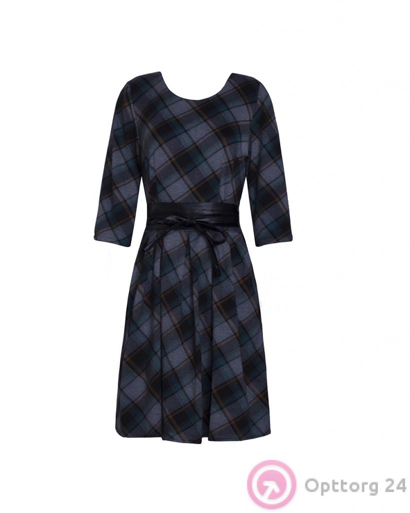 Платье-колокольчик синего цвета в клетку оптом