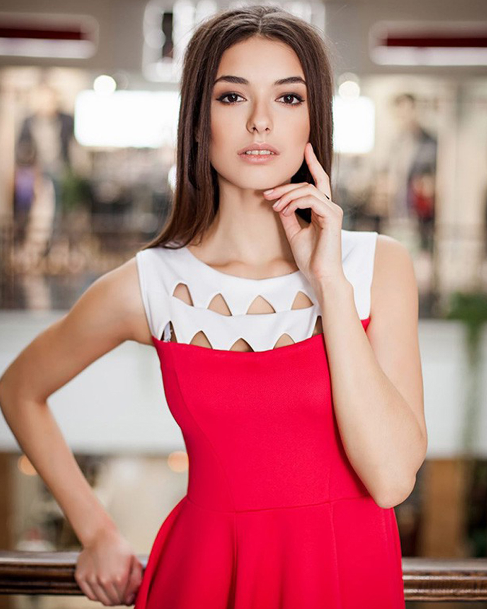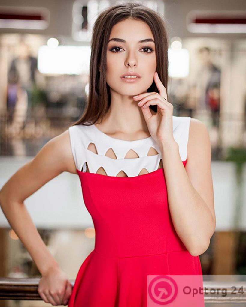 Стильное платье без рукавов малинового цвета. Верх платья белый и декорирован треугольными вырезами. Низ расклешенный со складками, выполнен из ткани малинового цвета. Благодаря яркой расцветке платье отлично смотрится и бросается в глаза. Прекрасно подойдет как модницам, так и почитательницам стиля casual.