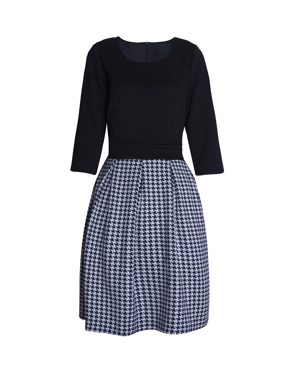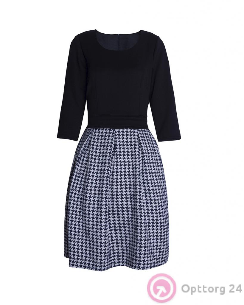Модель характеризуется контрастной отделкой и притачной расклешенной юбкой. Идеальное сочетание цветов придают модели некую оригинальность.
