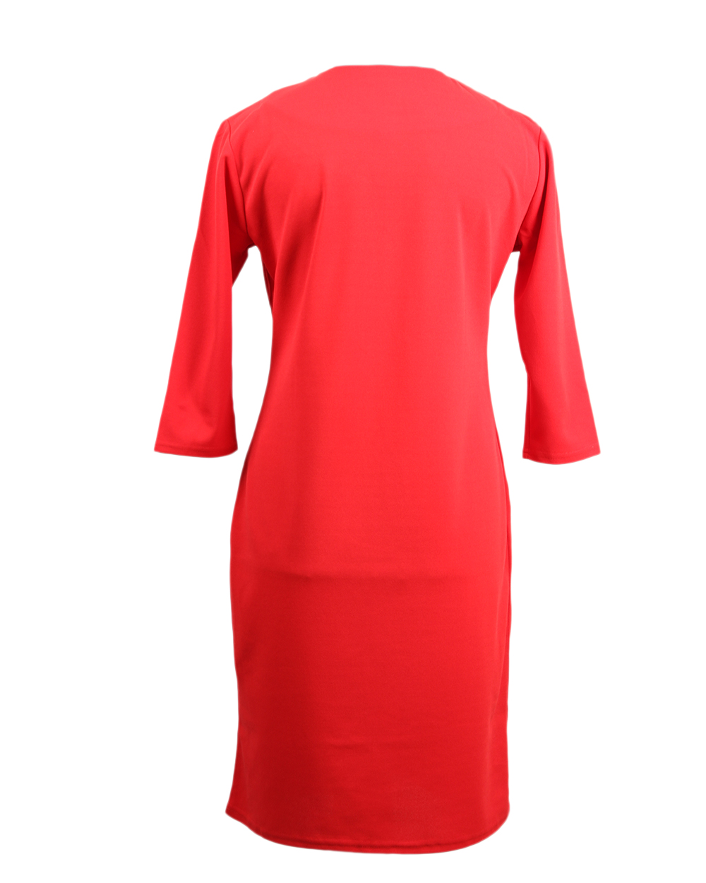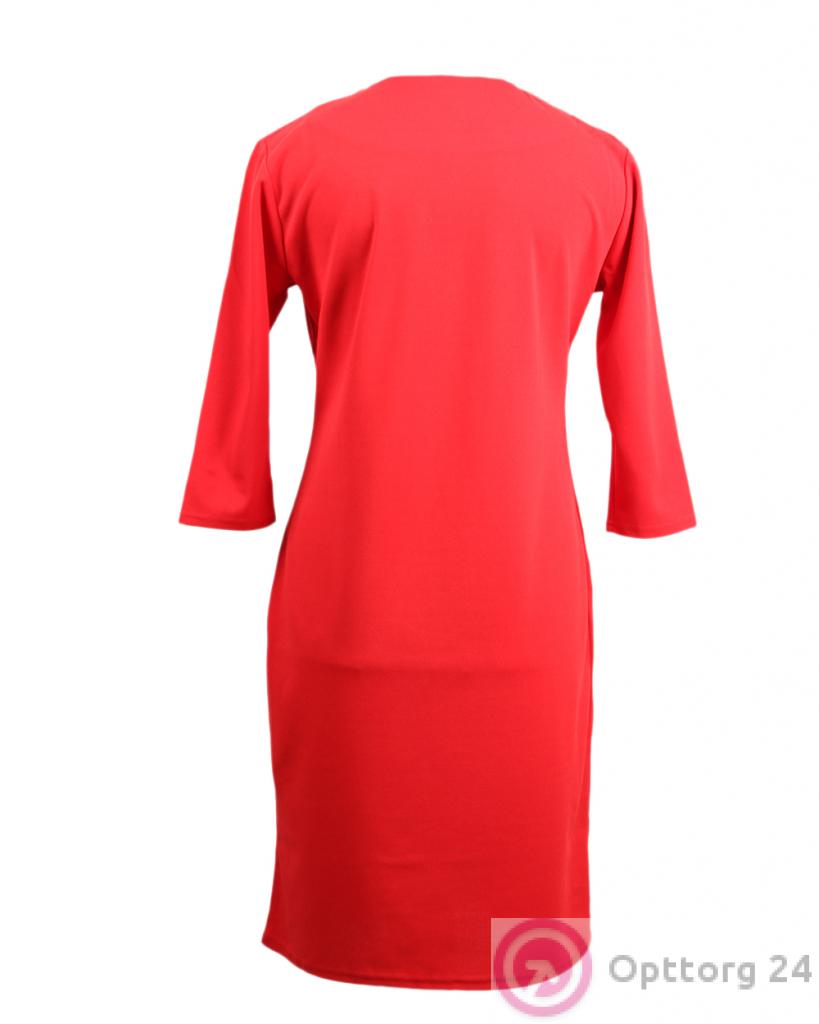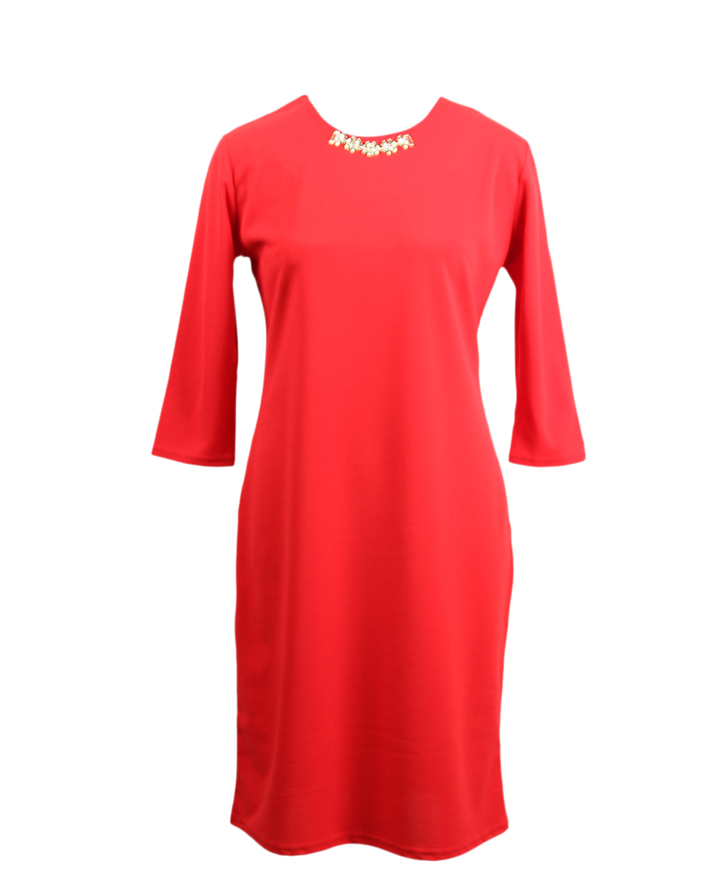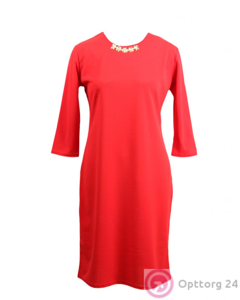 Яркое облегающее платье с округлой горловиной и колье. Изделие отлично подойдет для носки на каждый день.