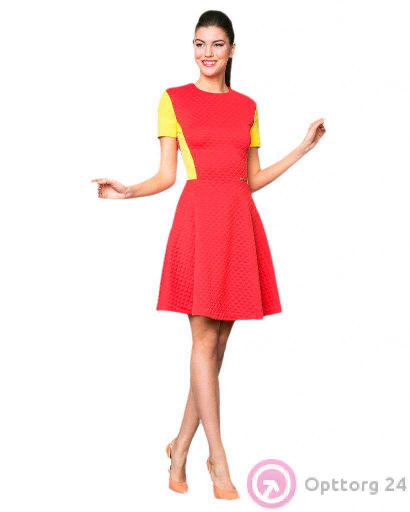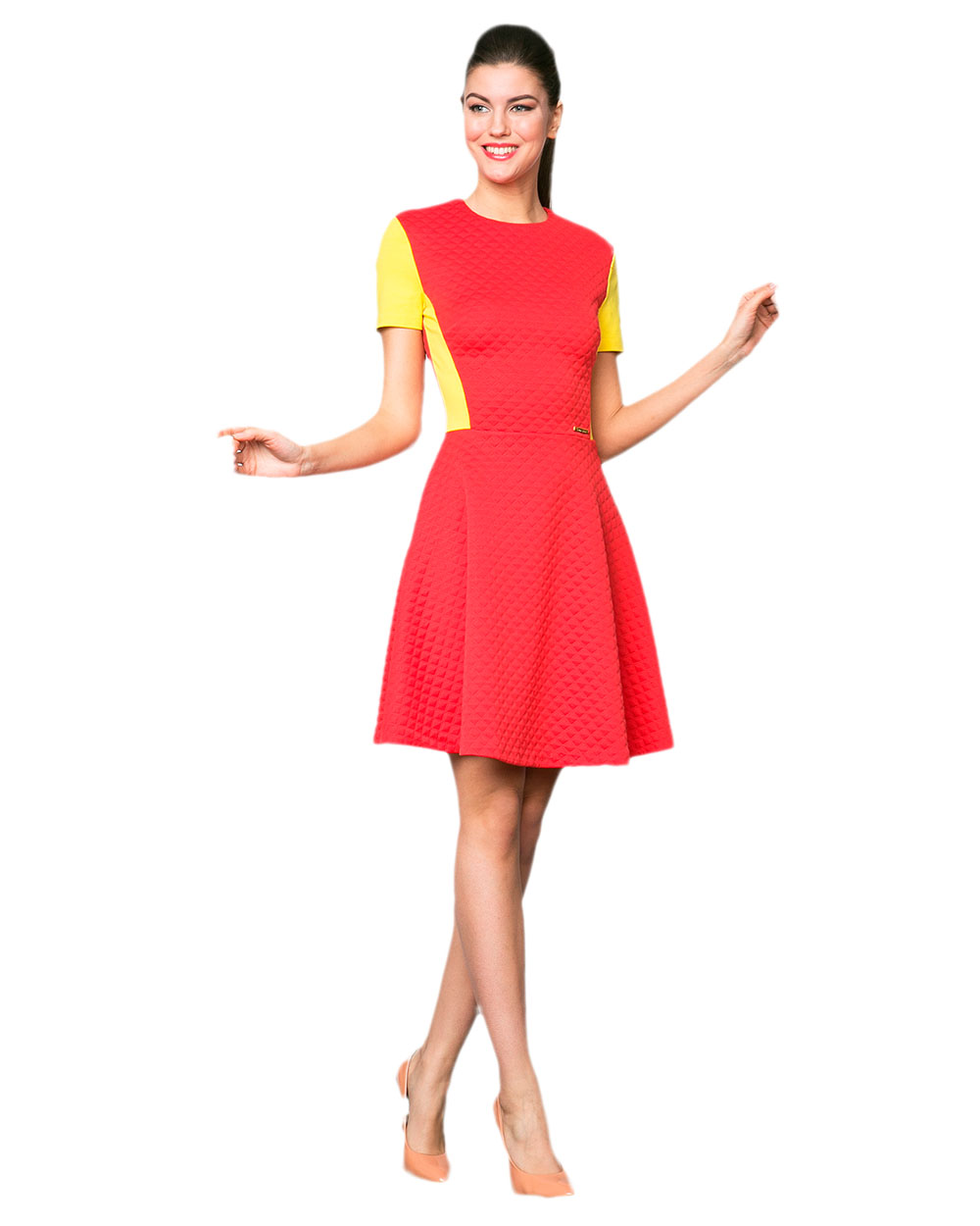 Женское платье красного цвета с желтыми рукавами. Облегающий крой и пышная расклешенная юбка.