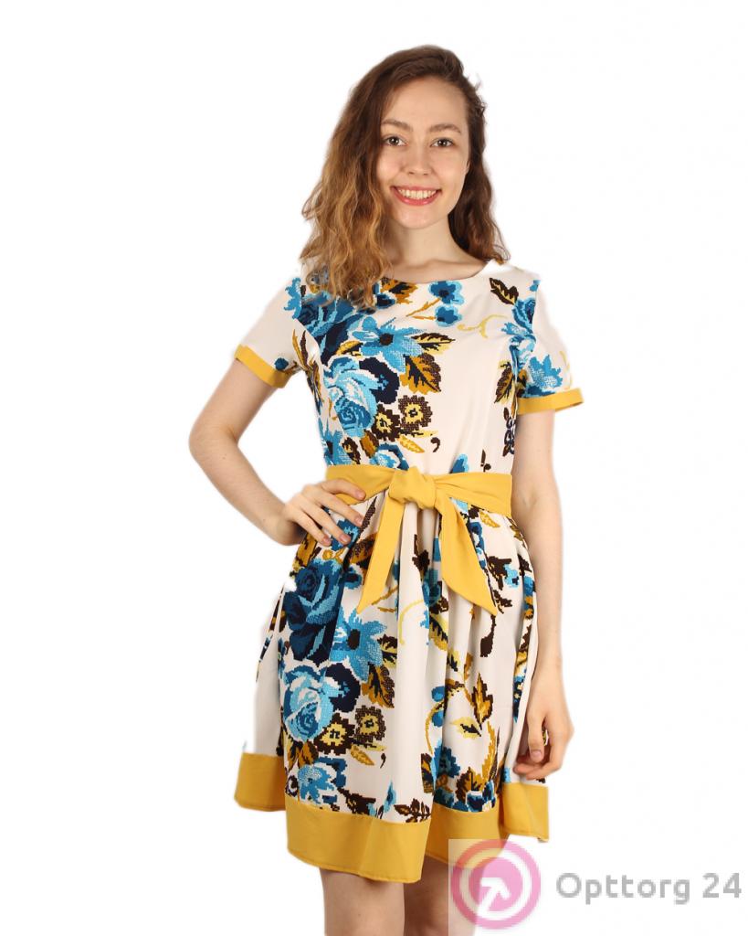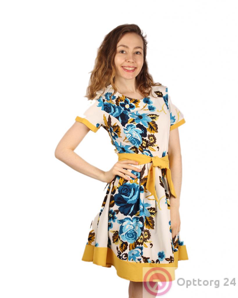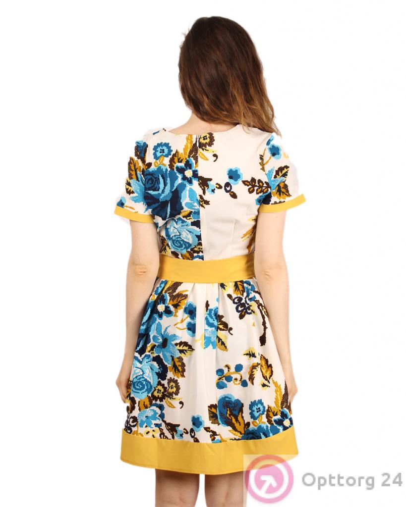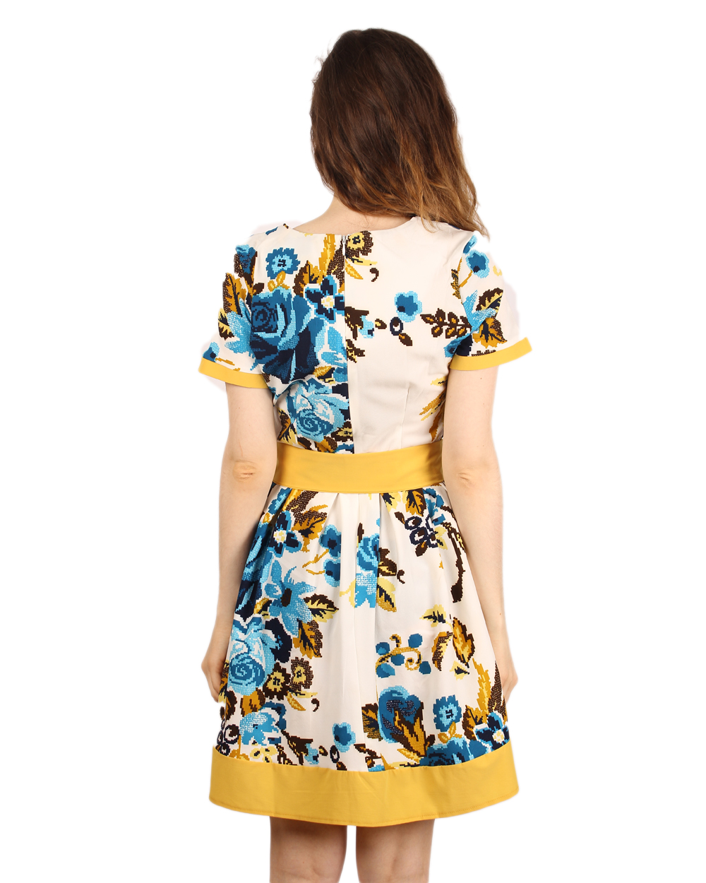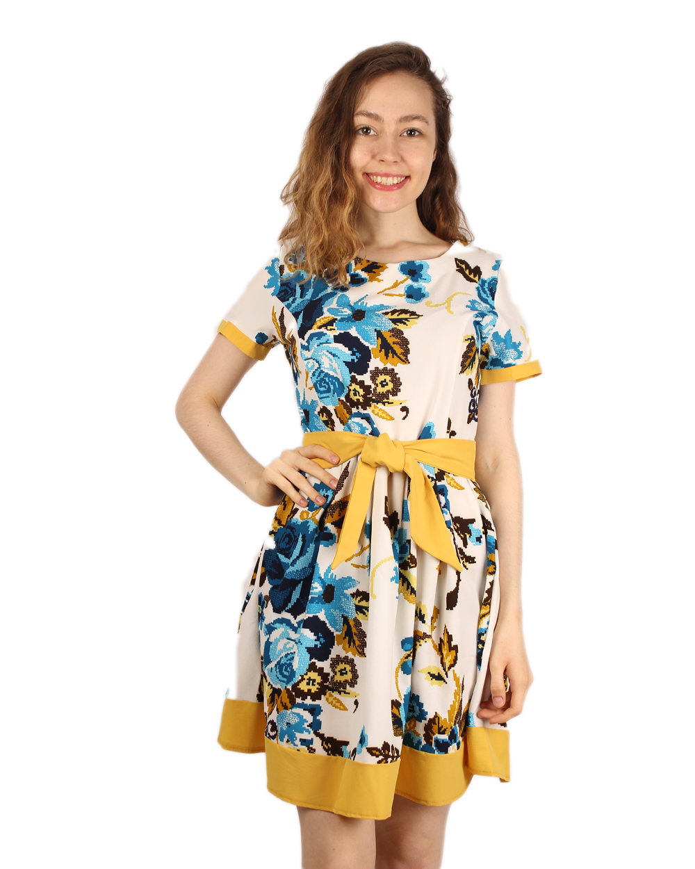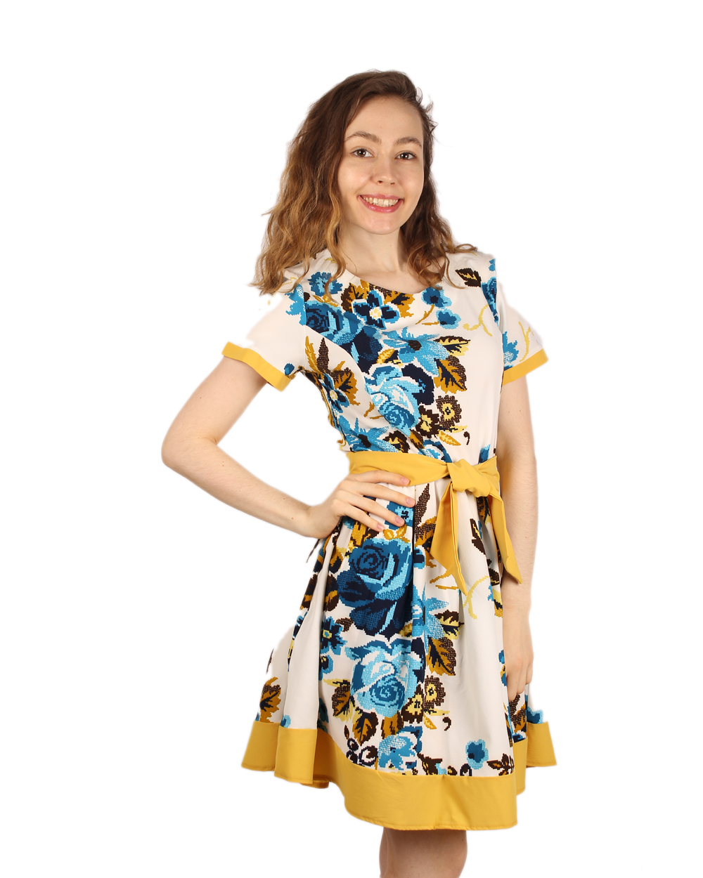 Легкое и воздушное летнее платье средней длины с расклешенным низом. На ткани - красивый принт в виде больших роз синего цвета. Смотрится очень эффектно. Юбка в складку, расклешенная, рукава вороткие. Низ и рукава отделаны желтой лентой. Верх приталенный, с округлой горловиной. Платье завязывается на пояс.