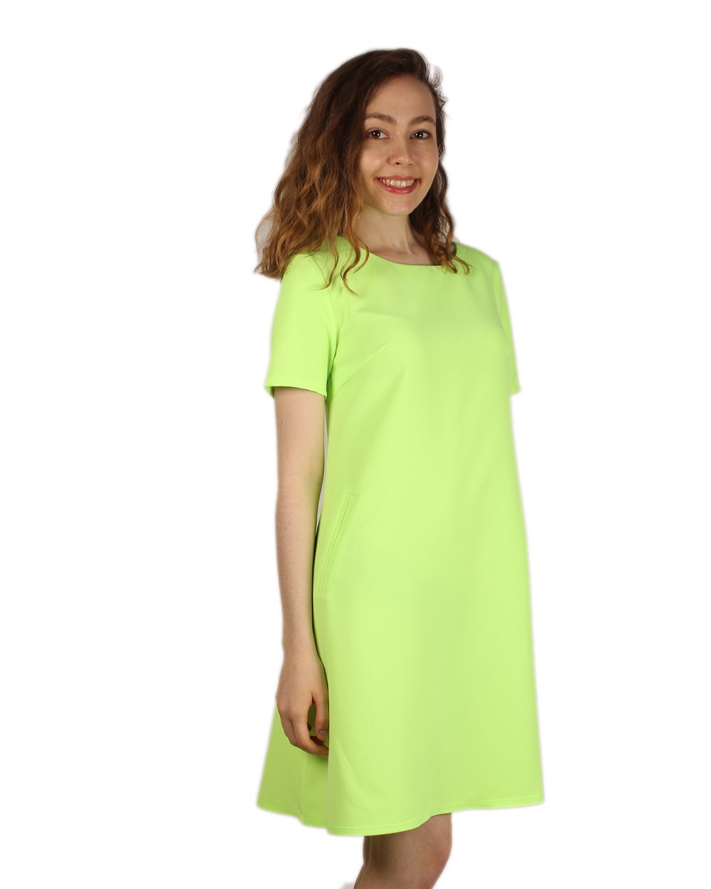 Яркое летнее платье для неординарной и смелой девушки. Модель выполнена из качественной неоновой ткани лаймового цвета. Полуприлегающий силуэт платья с вертикальными выточками красиво подчеркивает все достоинства фигуры. Низ немного расклешенный. Вырез неглубокий, в форме "лодочки". Рукава короткие.