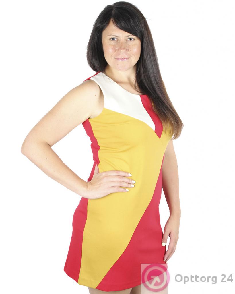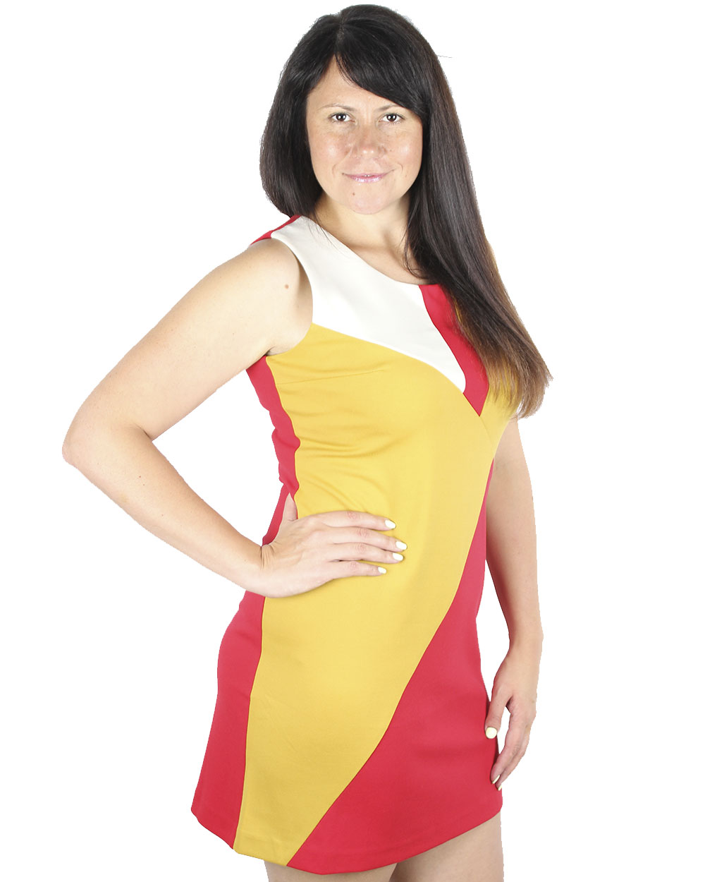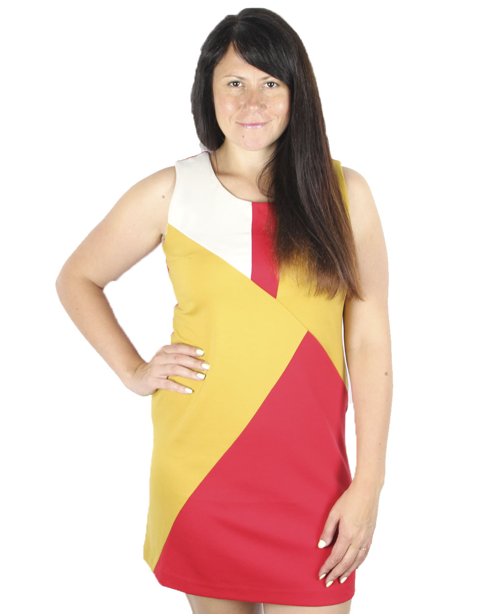 Платье горчично-бело-красного цвета прямого кроя выполнена в виде мозайки.