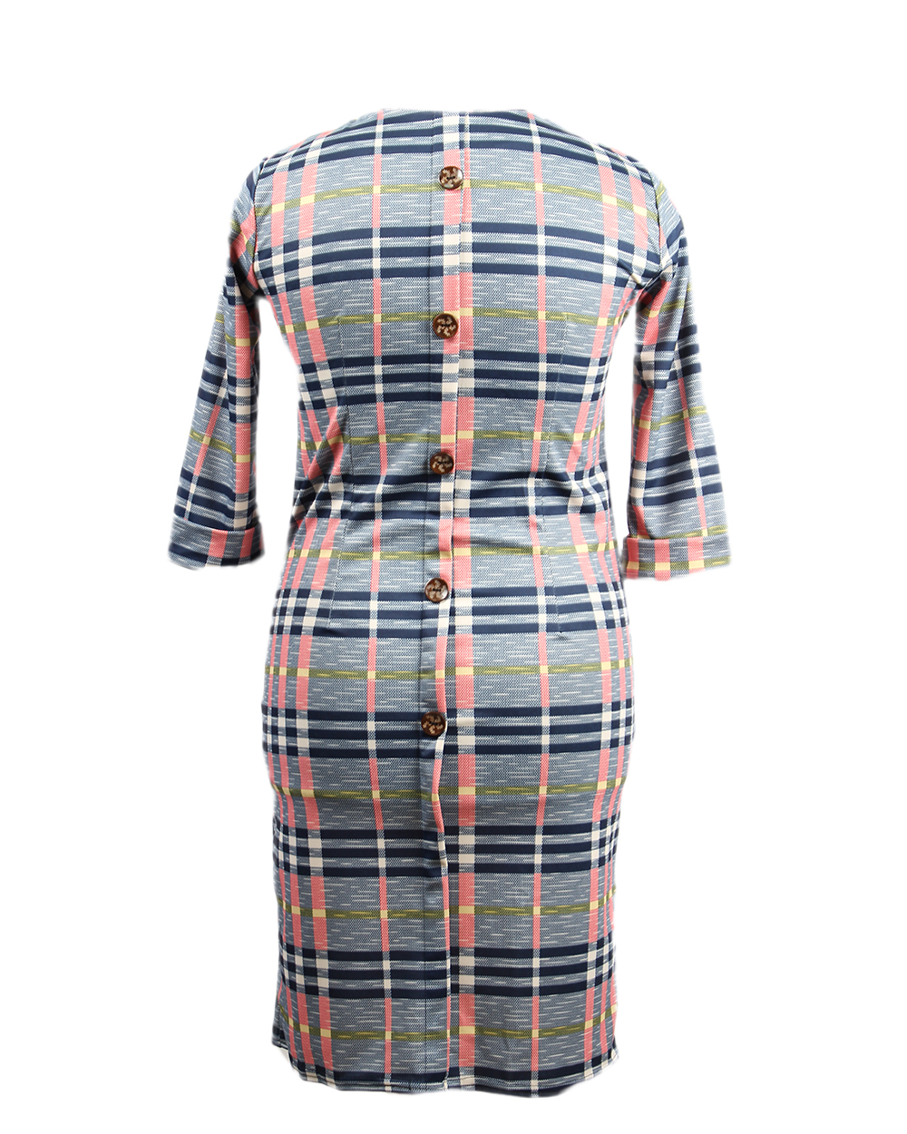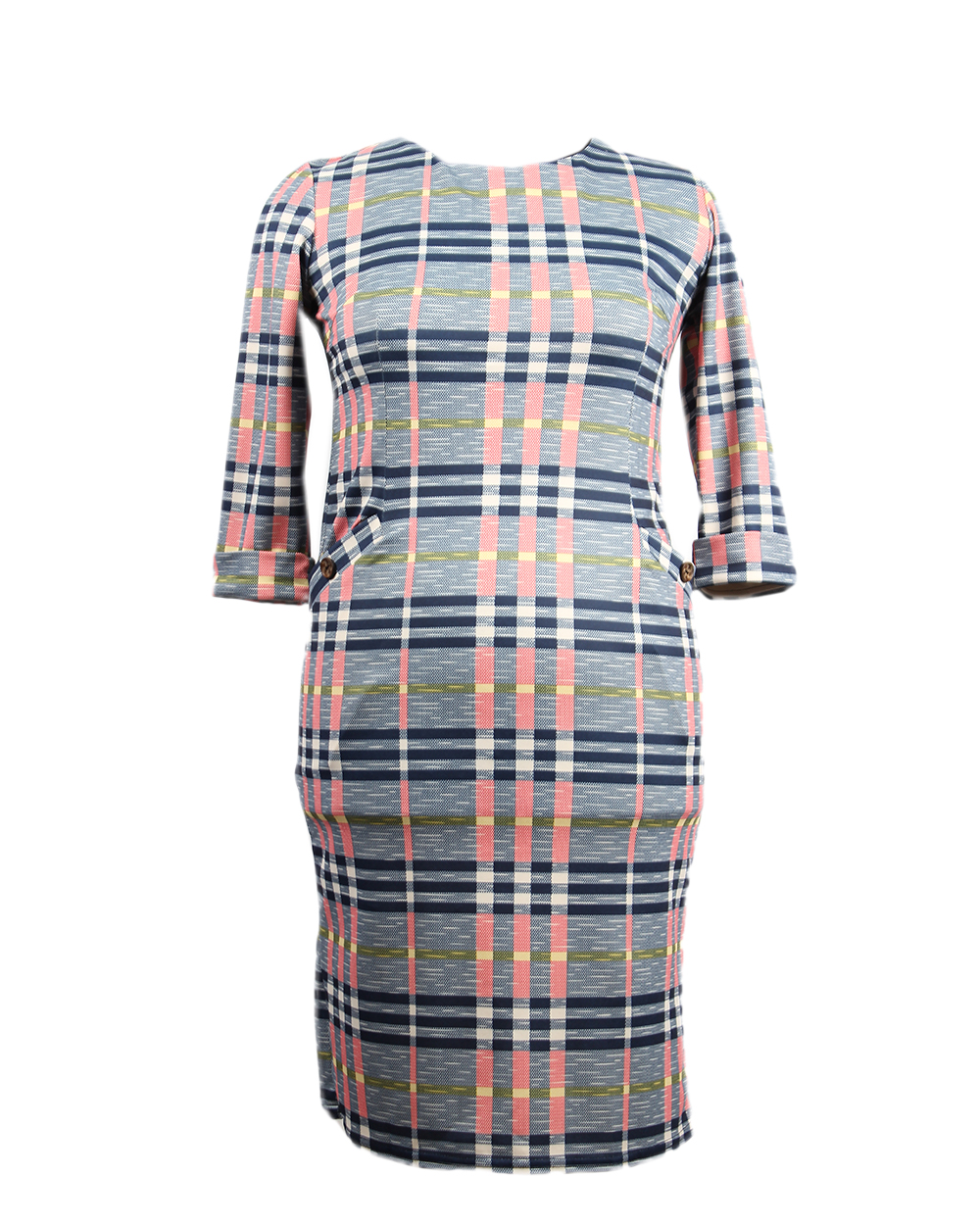 Облегающее женское платье с рукавами в три четверти. Изделие имеет округлую горловину.