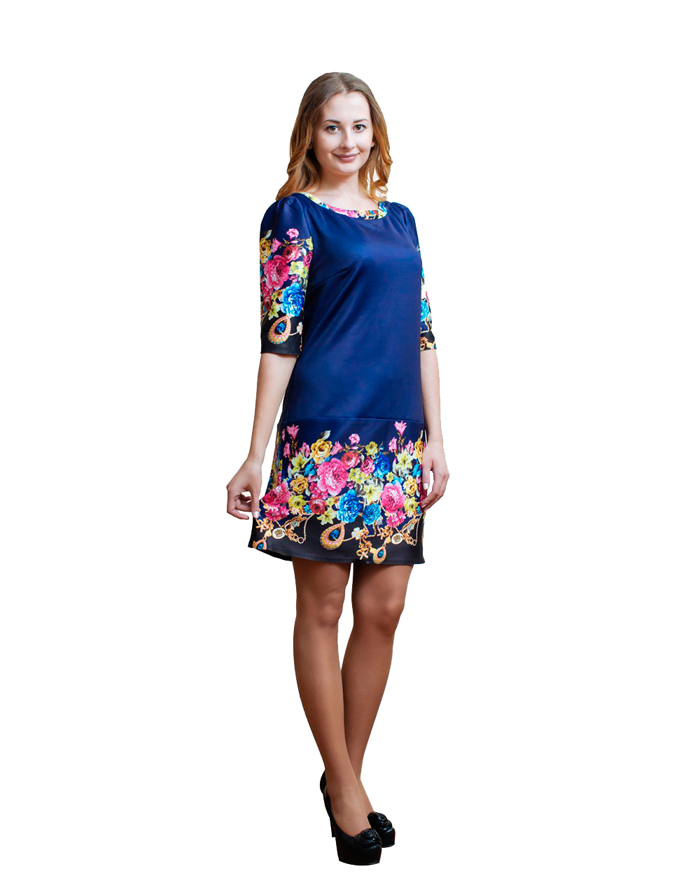 Оригинальное платье, рукава и низ которого усыпаны россыпью ярких цветов. Модный тренд этой осени - насыщенный синий цвет, а также оригинальный рисунок, обязательно понравятся даже самым изощенным модницам.