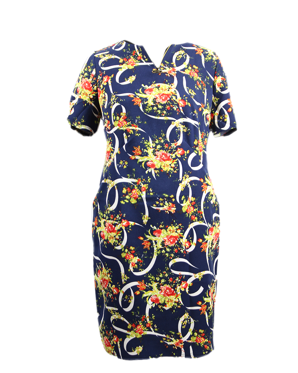 Женское летнее платье с короткими рукавами. Спереди есть V-образный вырез.