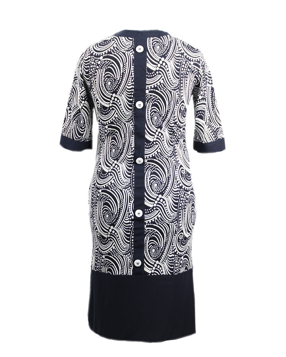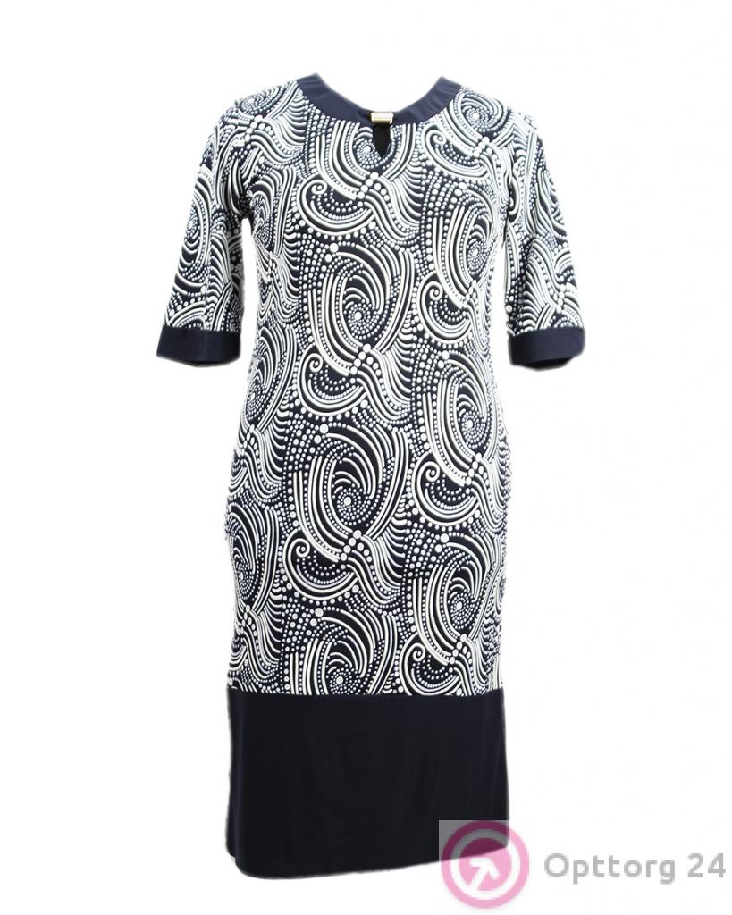 Стильное платье сине-белого цвета с однотонной окантовкой. Модель спереди имеет маленькое украшение на горловине.