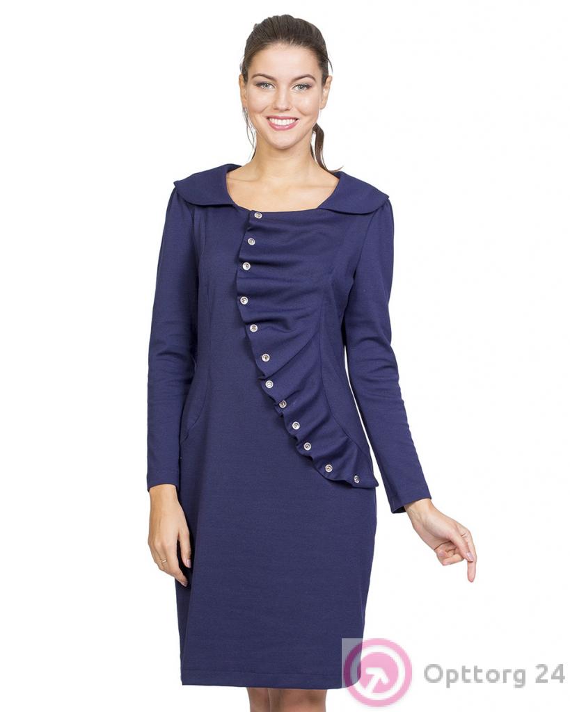 Платье "карандаш" синего цвета, украшено элегантными складками с пуговицами на груди.
