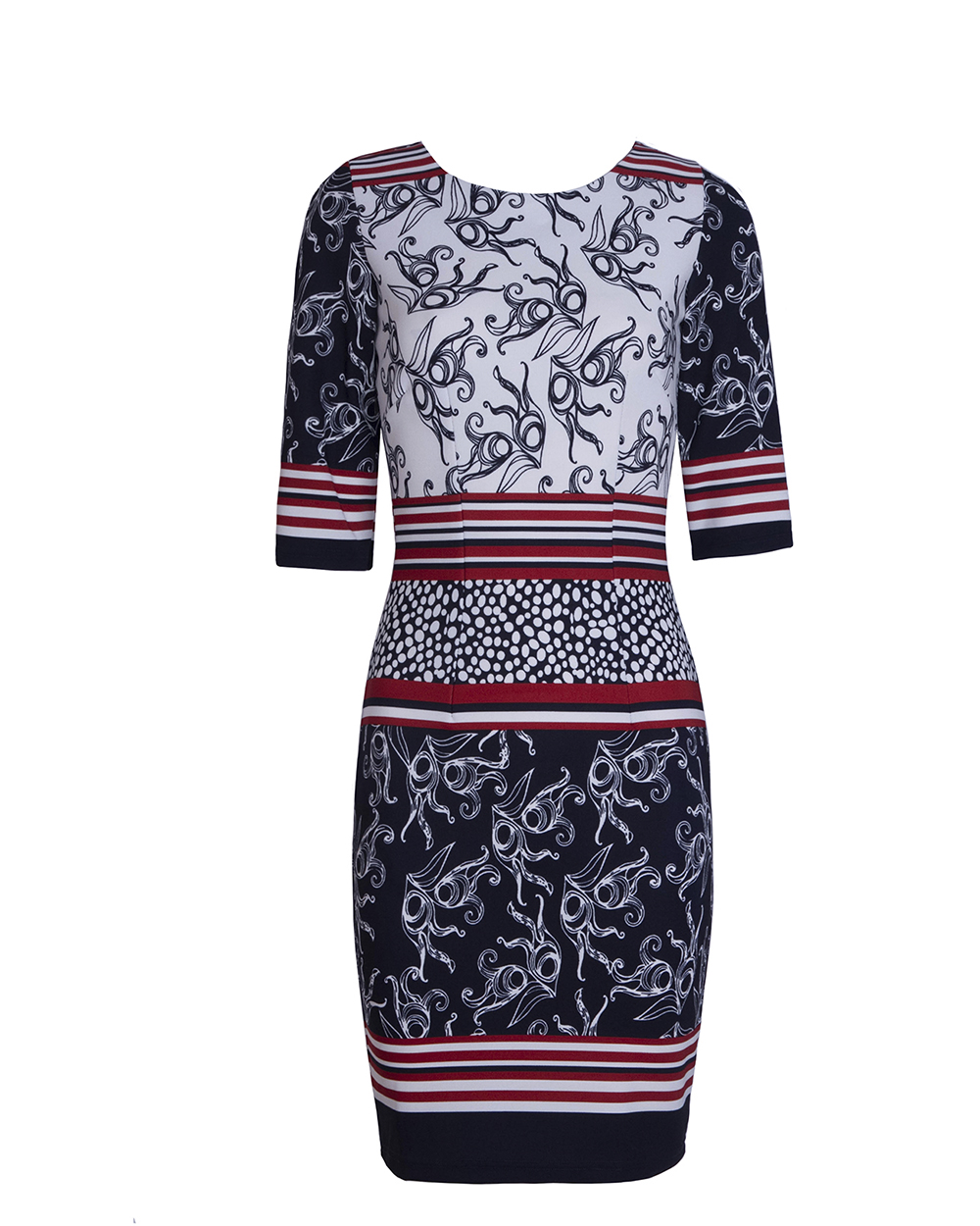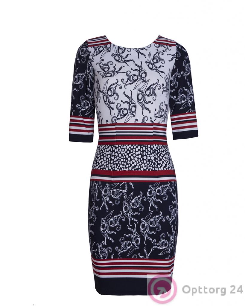 Оригинальное платье классического покроя. Сдержанный синий цвет разбавлен тонкими красными полосками и мелким рисунком.