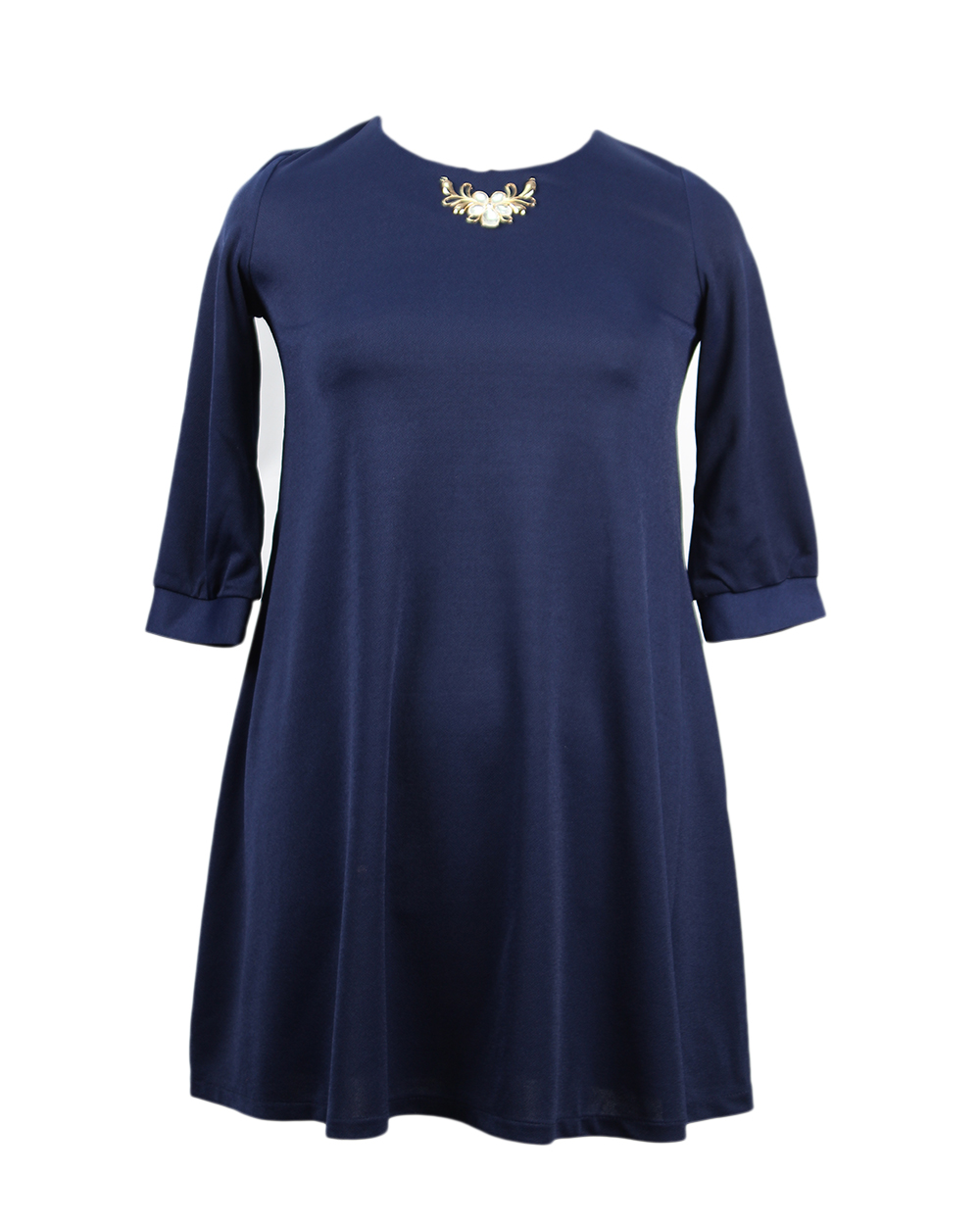 Легкое расклешенное платье с брошью на горловине. РУкава три четверти.