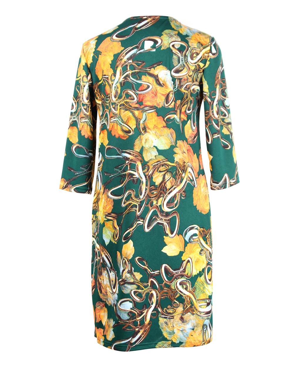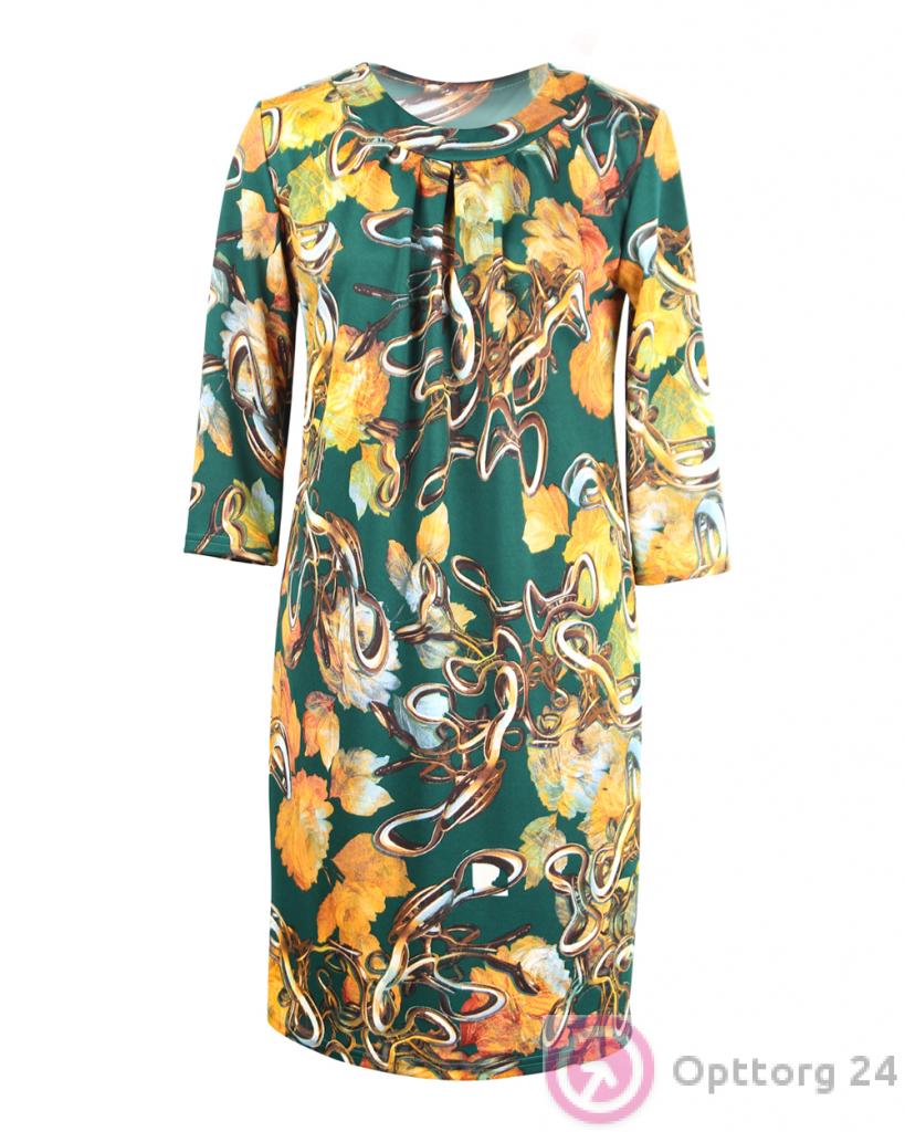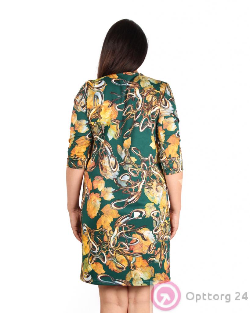 Красивое платье для полных модниц смотрится необыкновенно элегантно, благодаря простоте кроя и цветочному принту. Цветы украшают каждую женщину. Длина изделия немного выше колена. Данный наряд будет отлично смотреться с туфлями на высоком каблуке.