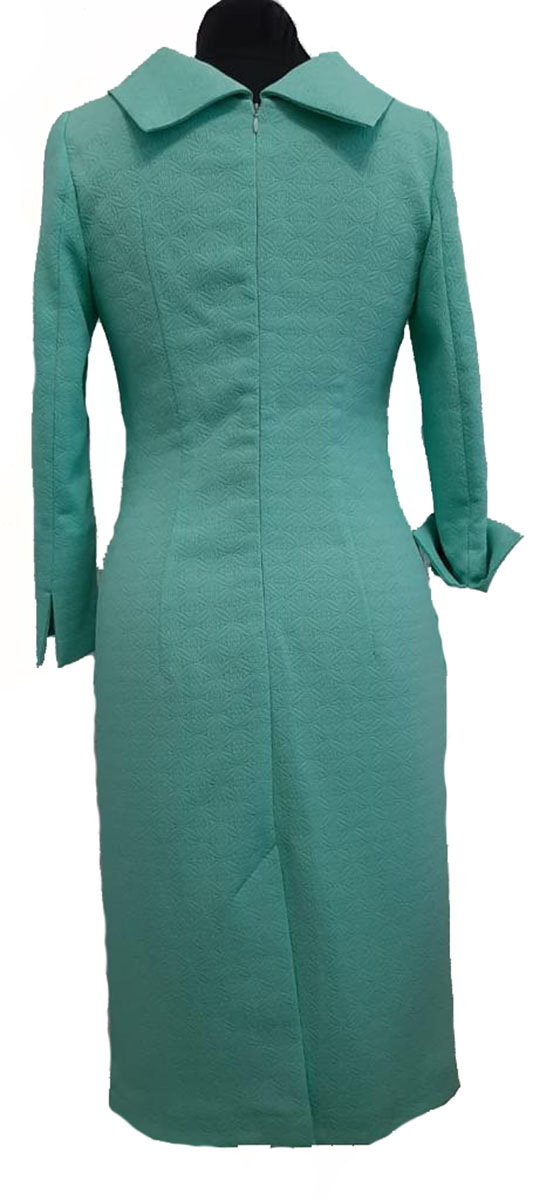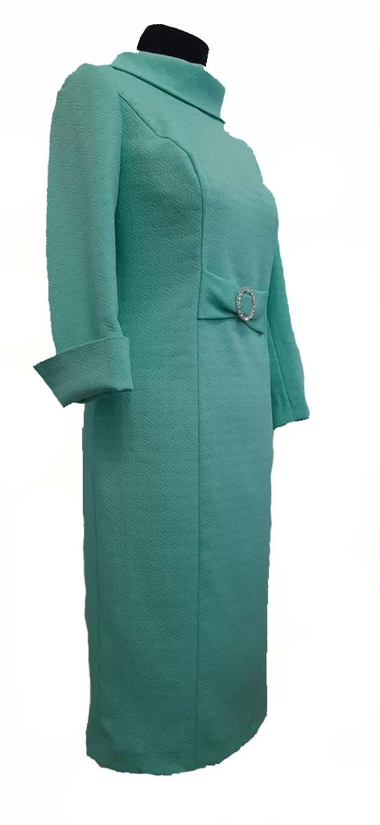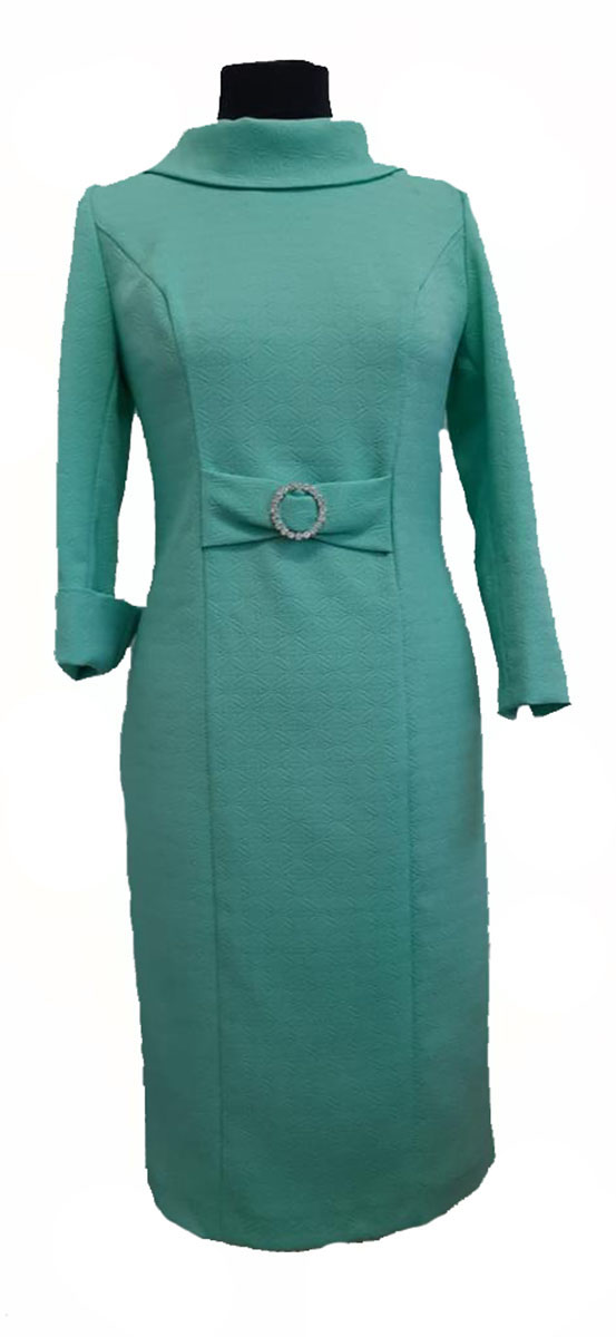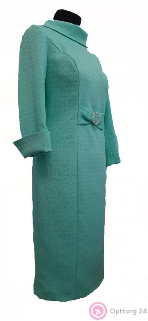 Описание: Платье женское мятного цвета с рукавом 3/4. На талии декорировано пряжкой. Приталенное. Сзади застежка на молнии и разрез.