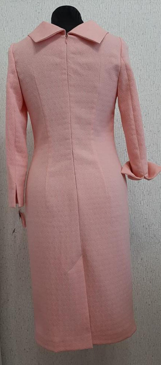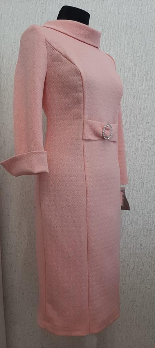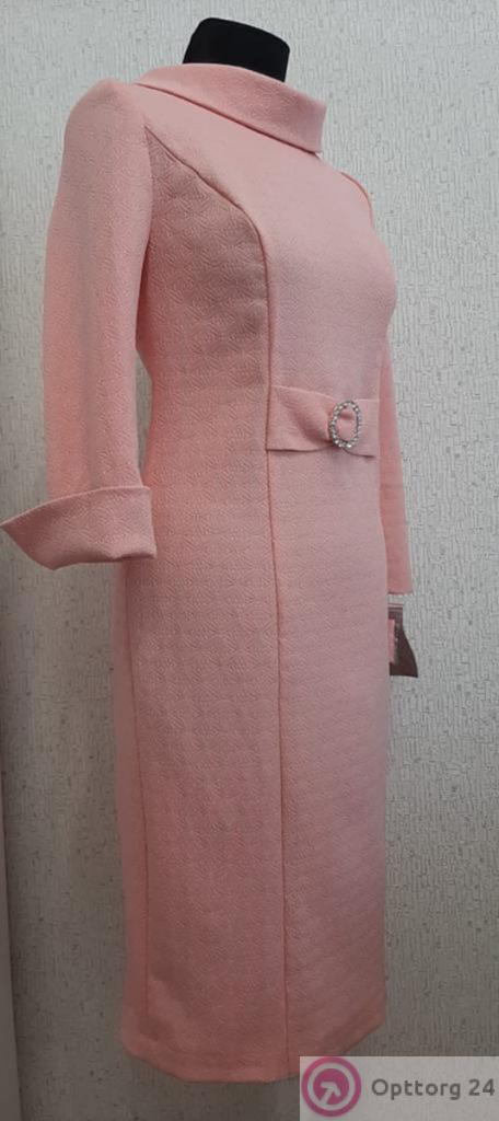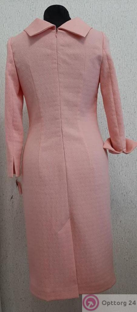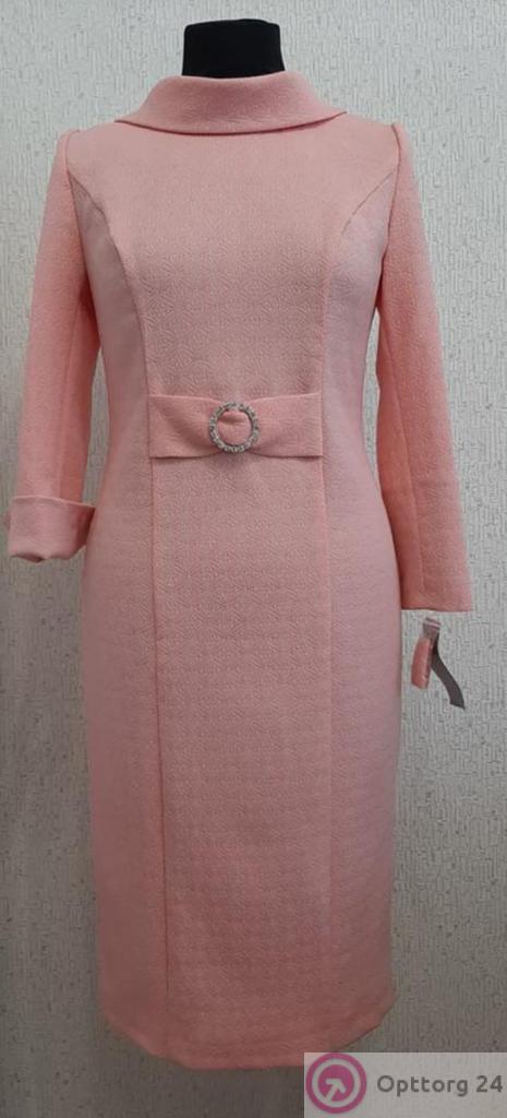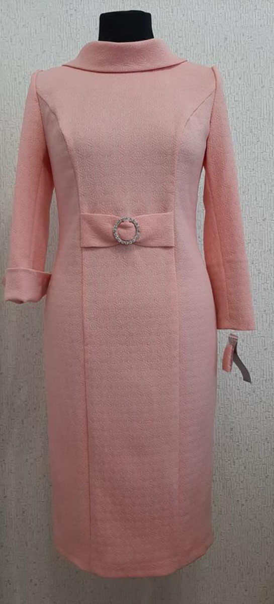 Описание: Платье женское персикового цвета с рукавом 3/4. На талии декорировано пряжкой. Приталенное. Сзади застежка на молнии и разрез.
