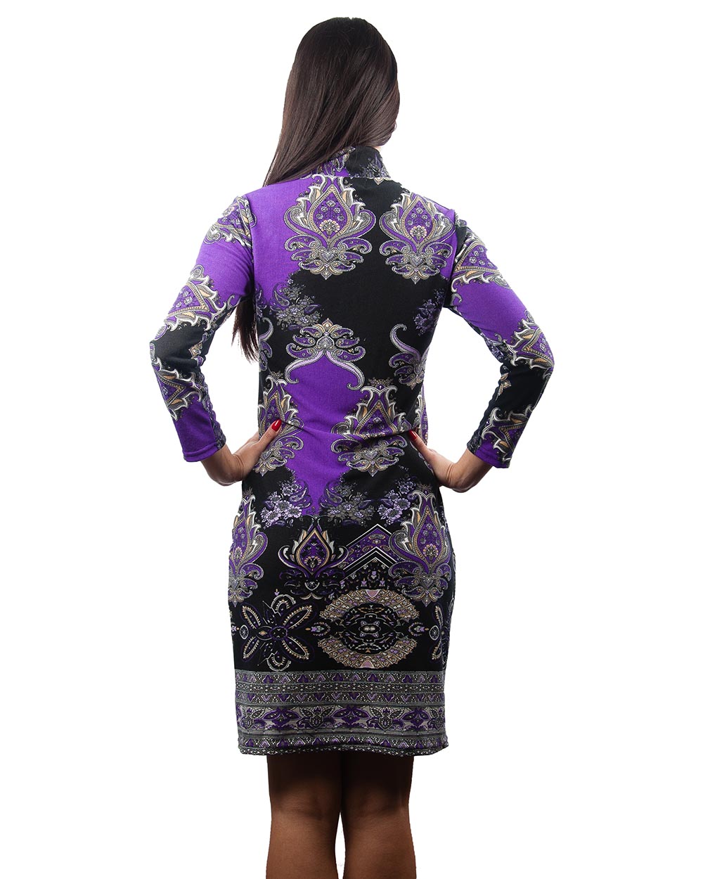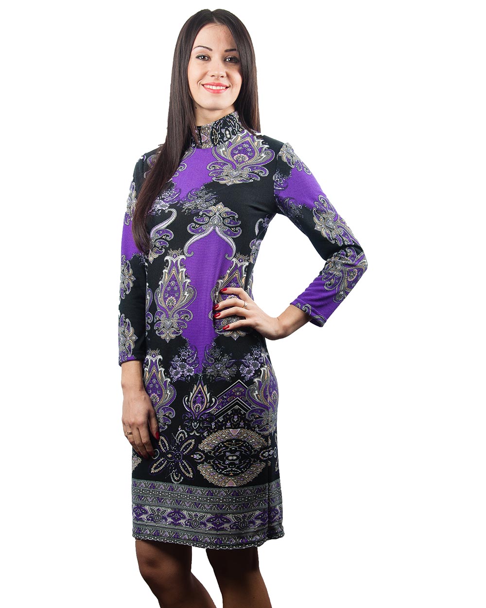 Благодаря своему простому и прямому крою, это очаровательное платье прекрасно сядет на любую фигуру. Милая классика удачно дополняется витиеватым черно-фиолетовым узором.