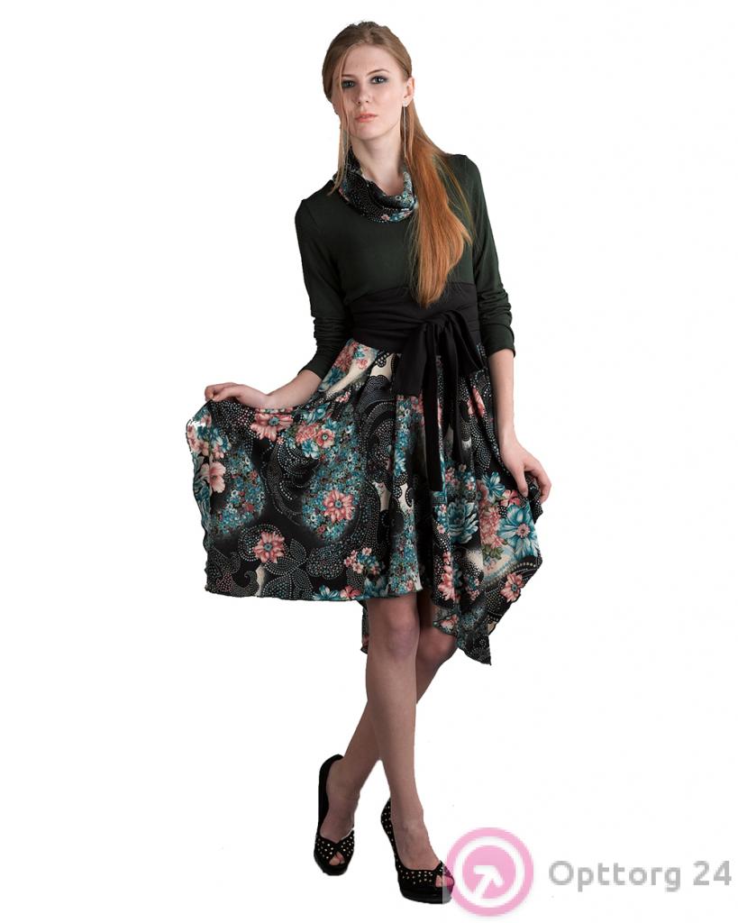 Платье женское черное с цветочной юбкой ассиметричного кроя оптом