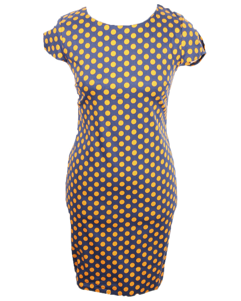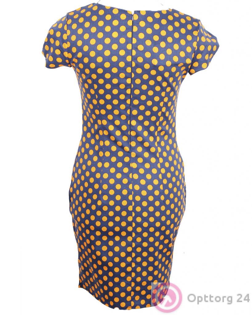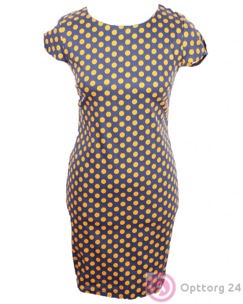 Женское платье черного цвета с оранжевым горохом модель с округлым вырезом на груди и укороченным рукавом на 3/4.