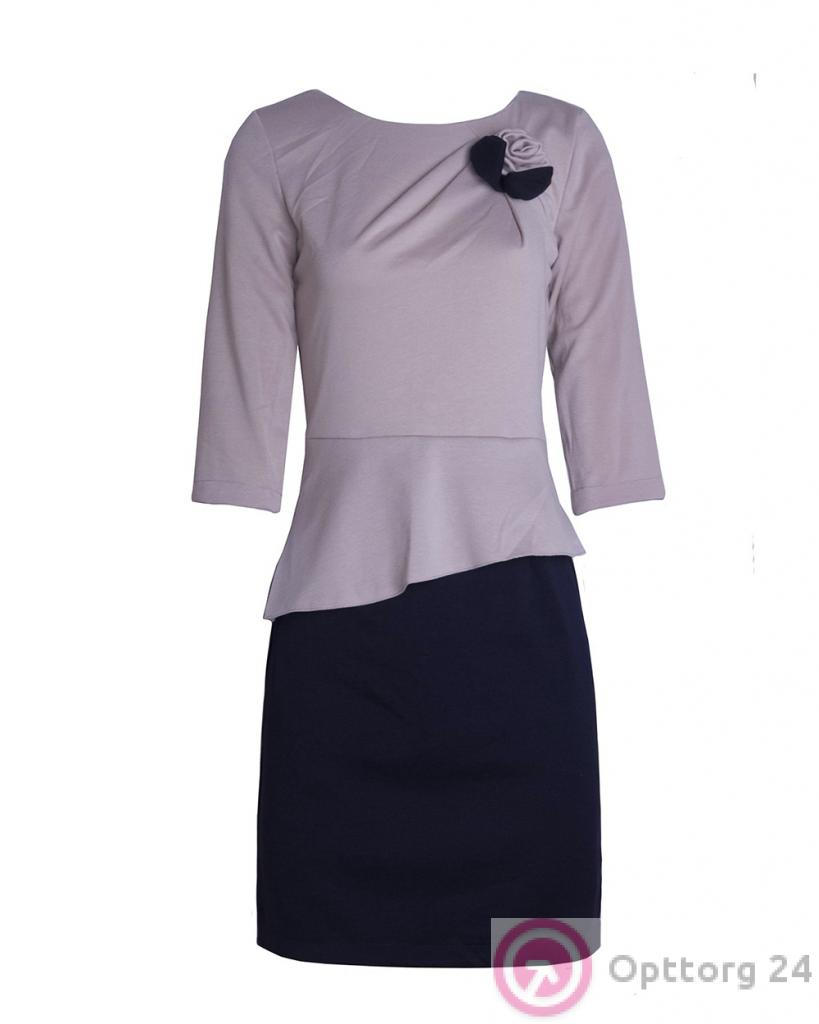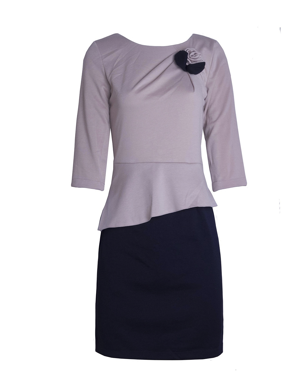 Оригинальное платье классического кроя. Экстравагантный объемный цветок спереди прекрасно дополняет деловой образ, а необычная баска, делает акцент на талии.