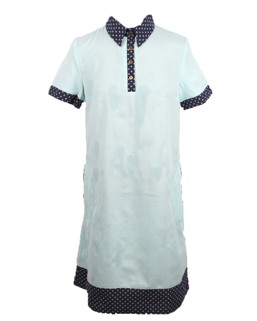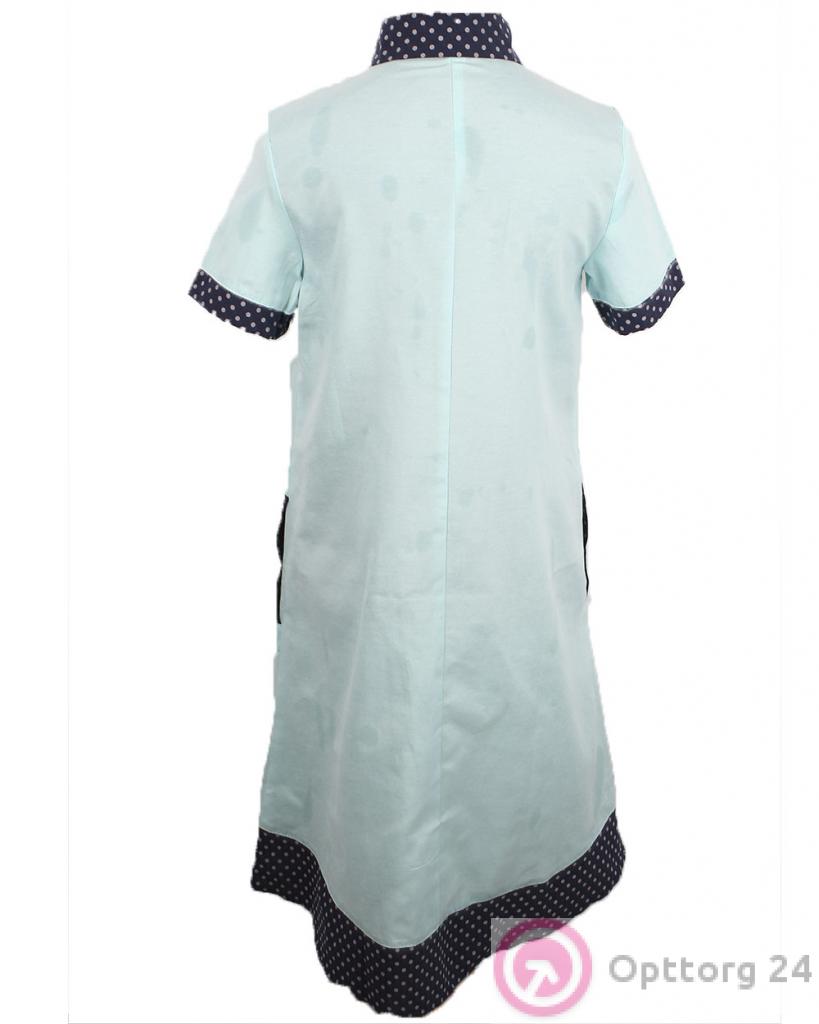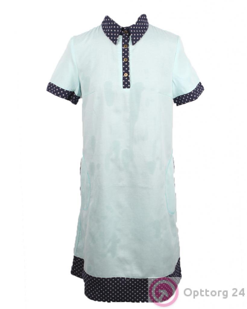 Женское платье бирюзового цвета с коротким рукавом и воротом синего цвета в мелкий горох.