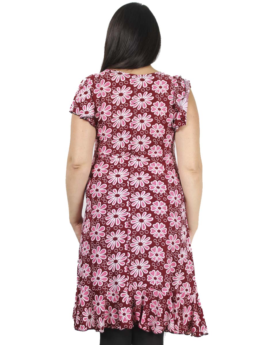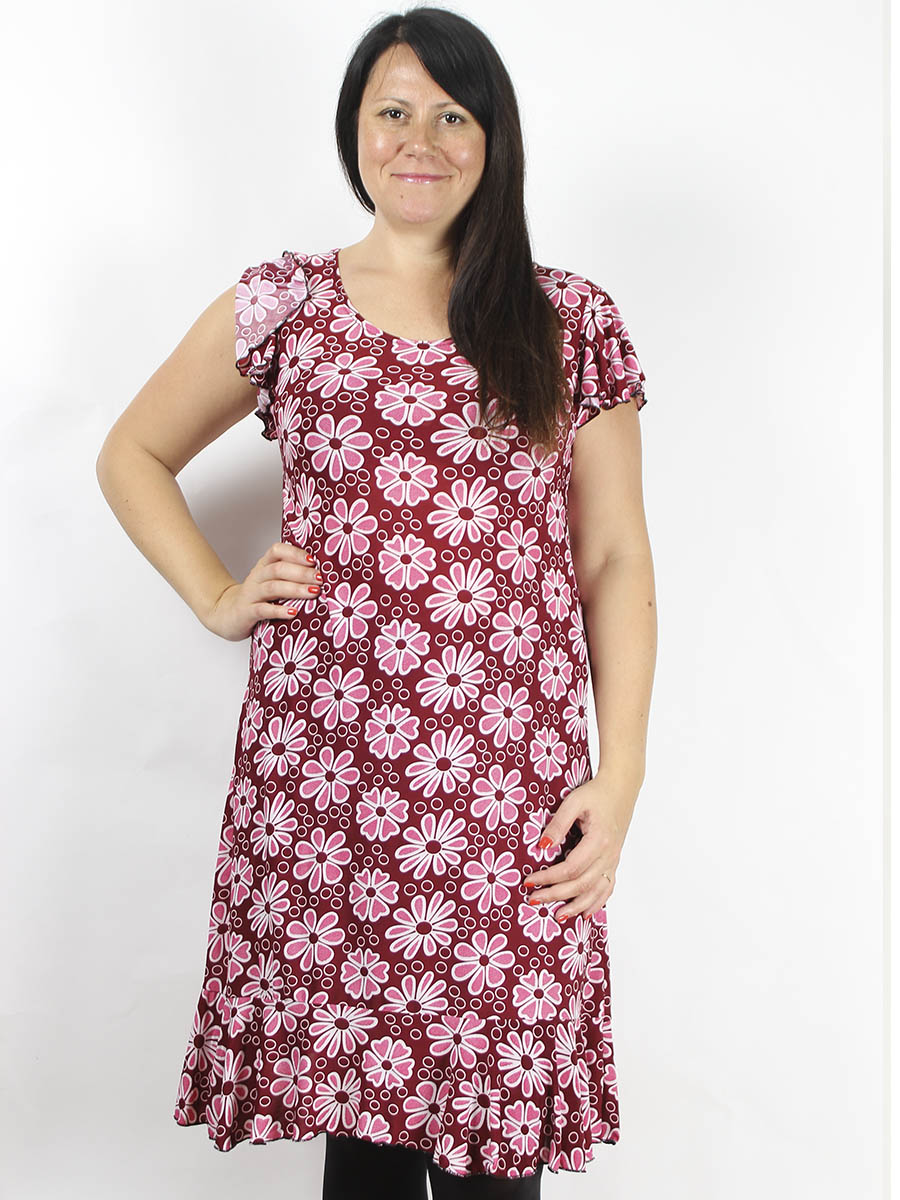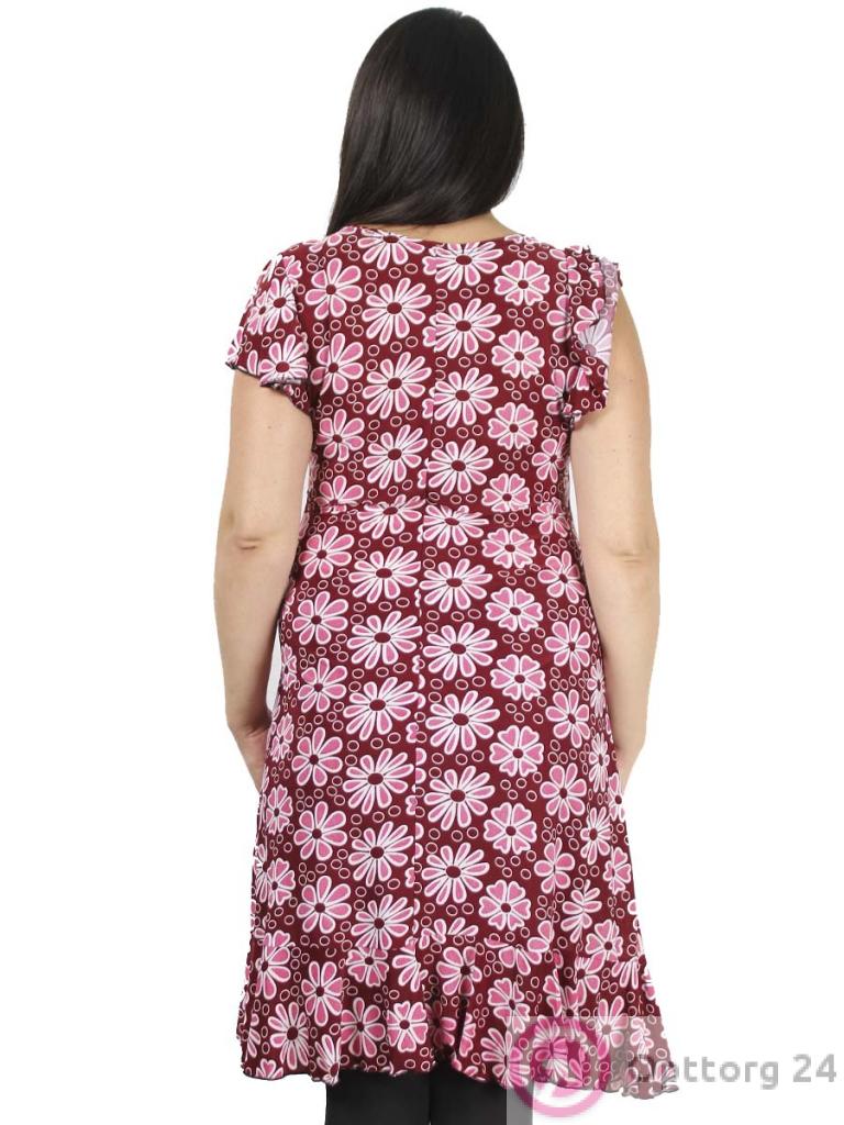 Женское платье больших размеров, модель красного цвета с белым рисунком.