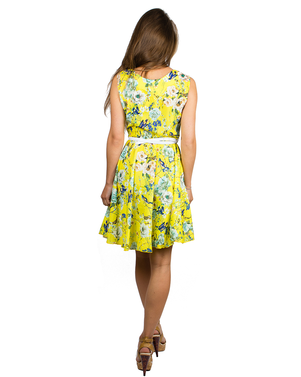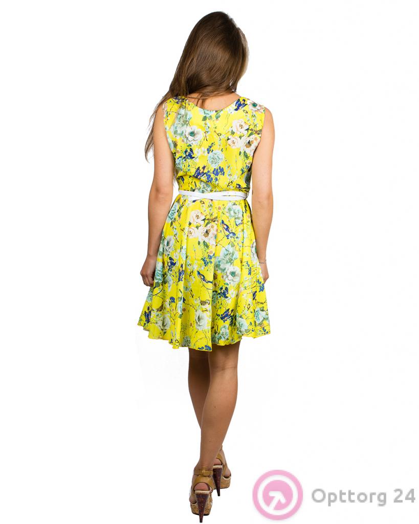 Платье женское летнее желтое с цветочным рисунком и пояском оптом