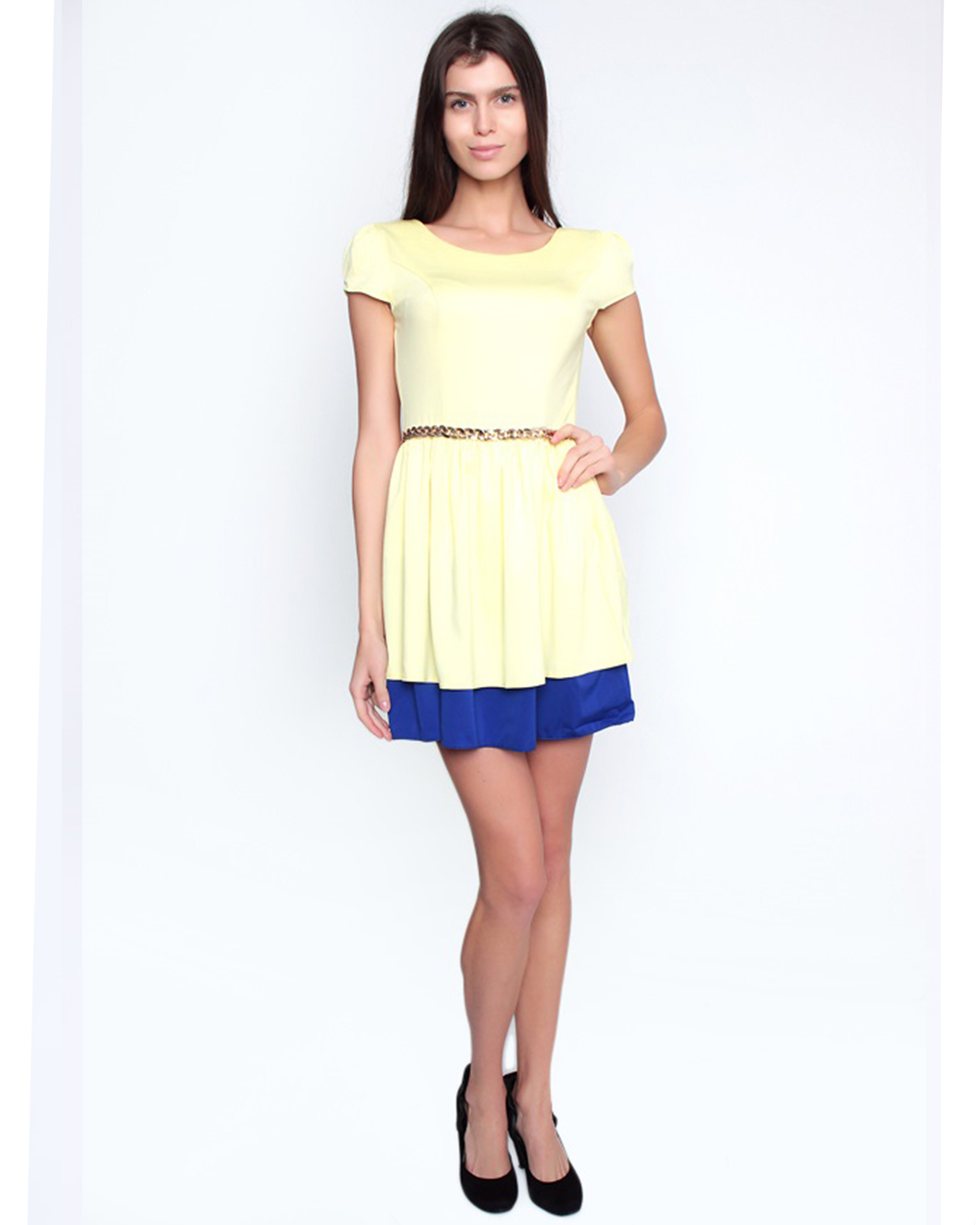 Платье женское нежно-лимонного цвета с блестящим поясом и синей подкладкой на юбке.