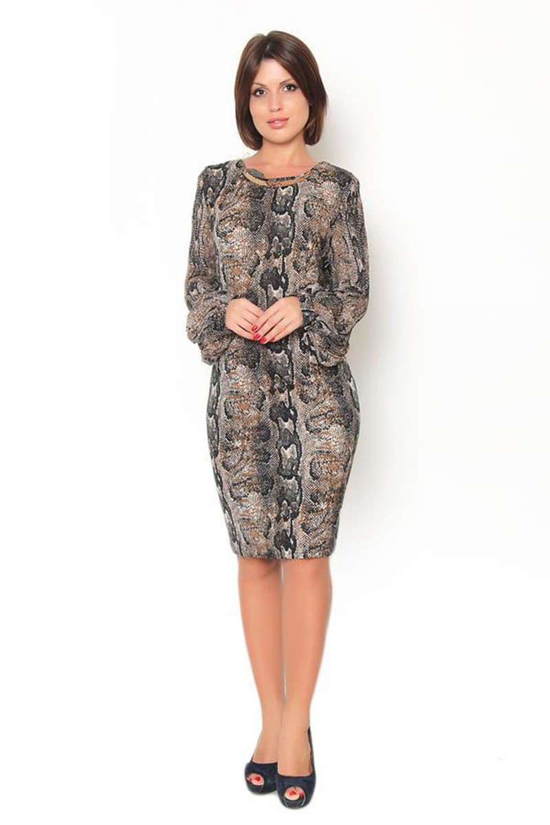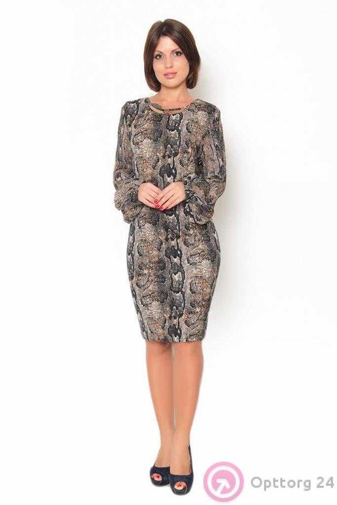 Описание: Платье женское с расцветкой под змеиную кожу, с длинным рукавом-фонариком и округлой горловиной. Приталенное.