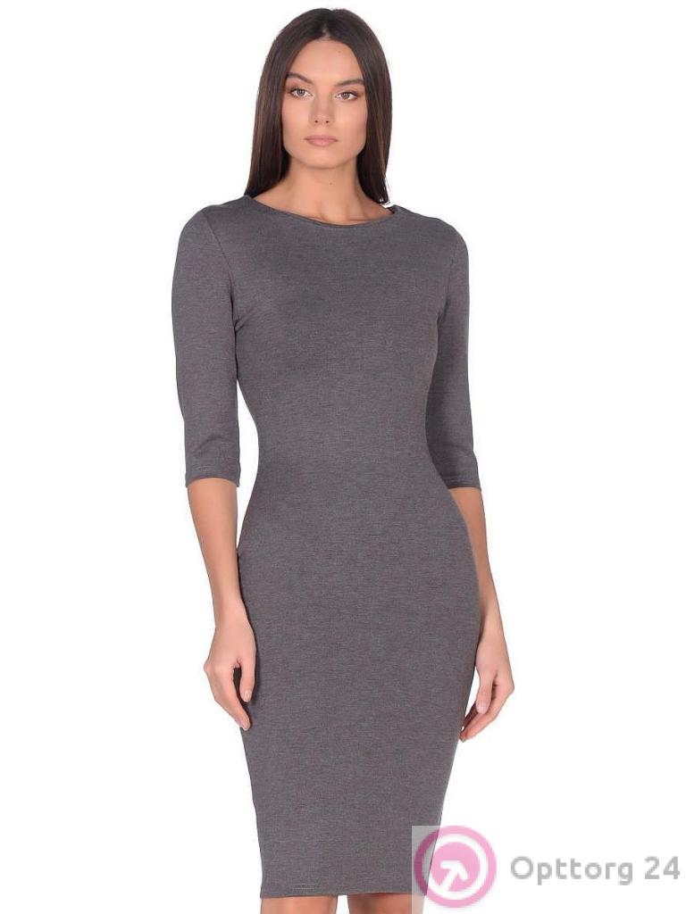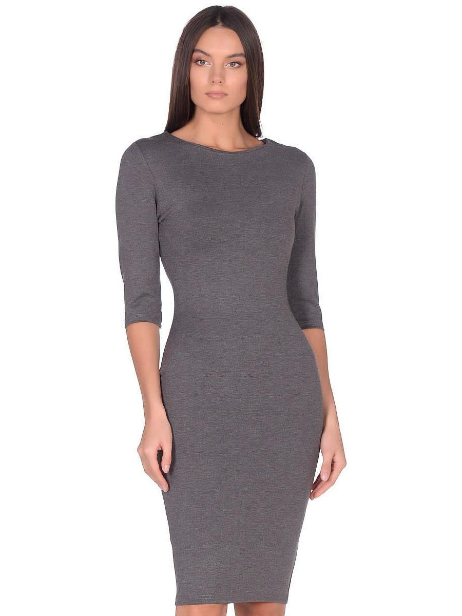 Описание: Обтягивающее женское платье, однотонное, приятно-серого цвета. Округлая горловина. Рукав 3/4.