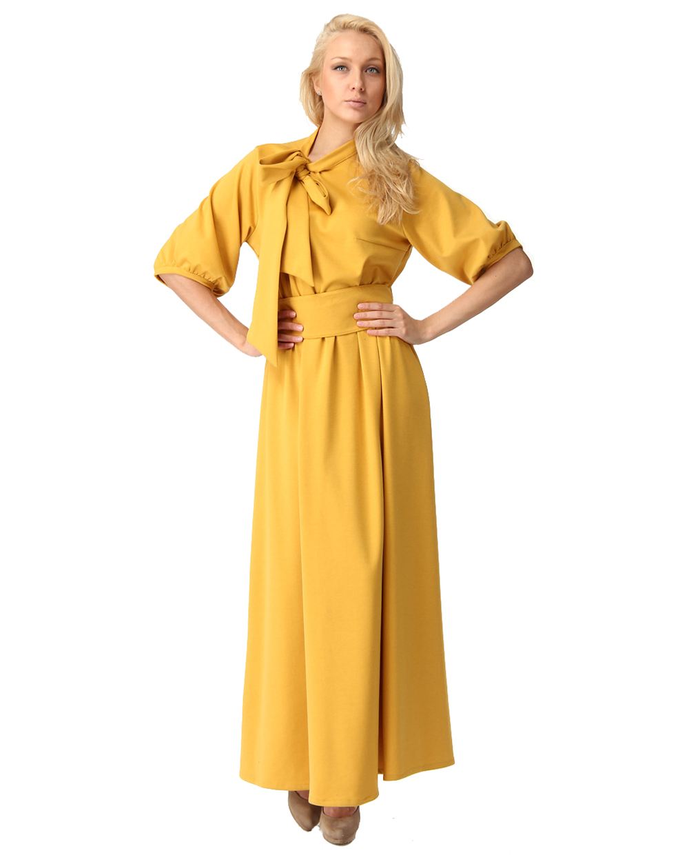 Это необычное платье, покоряющее своей одноцветностью и винтажным кокетством, словно окунули в жидкое солнечное золото, забрав лишь самый теплый и сочный оттенок желтого.