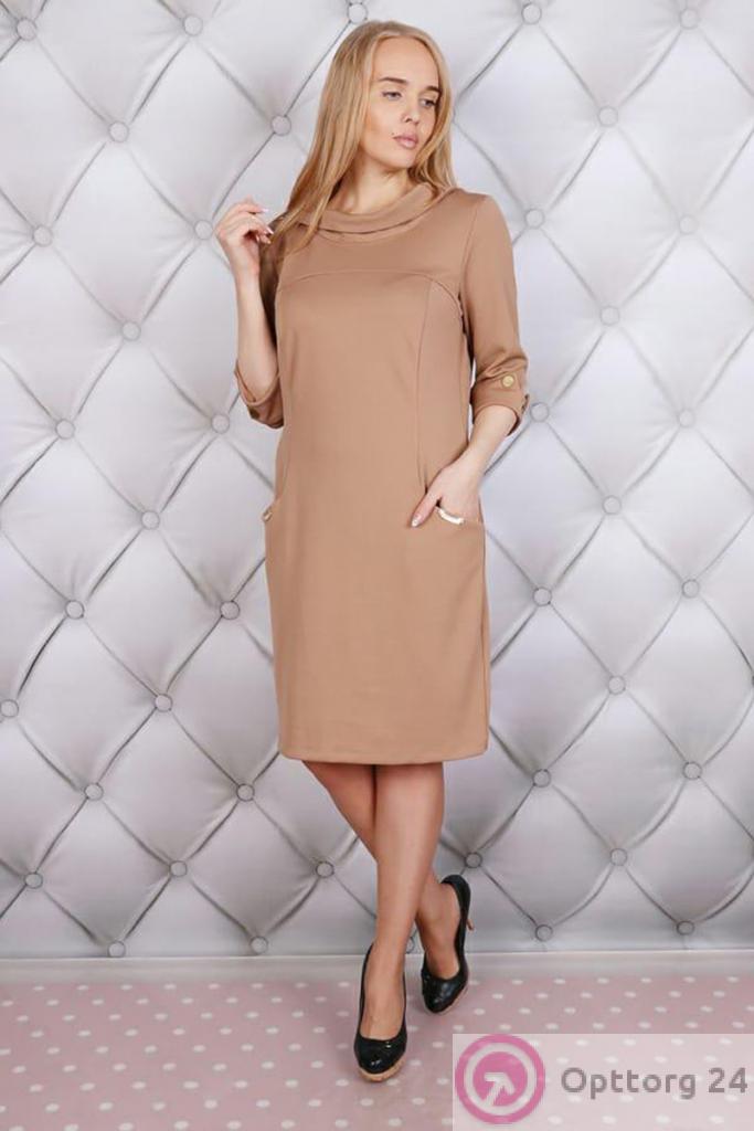 Описание: Платье женское бежевого цвета, прямого кроя, с карманами. Рукав 3/4. Есть декор на рукавах и карманах.