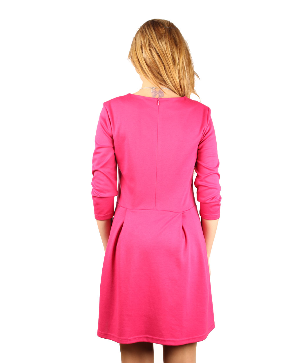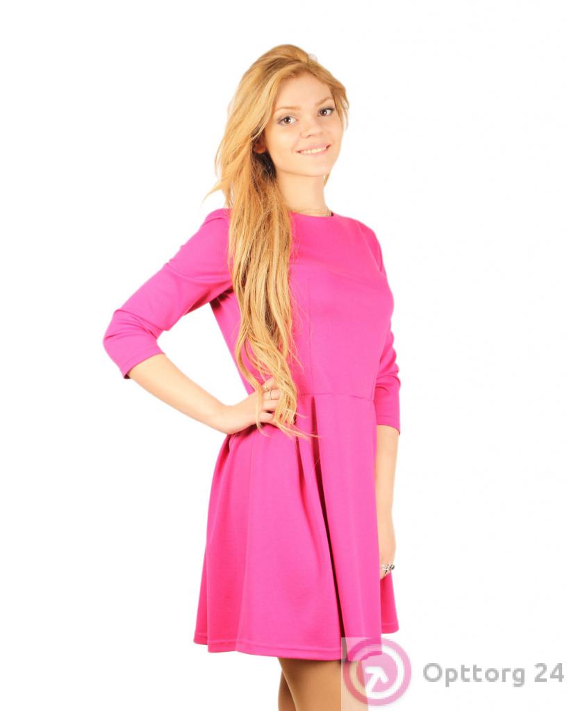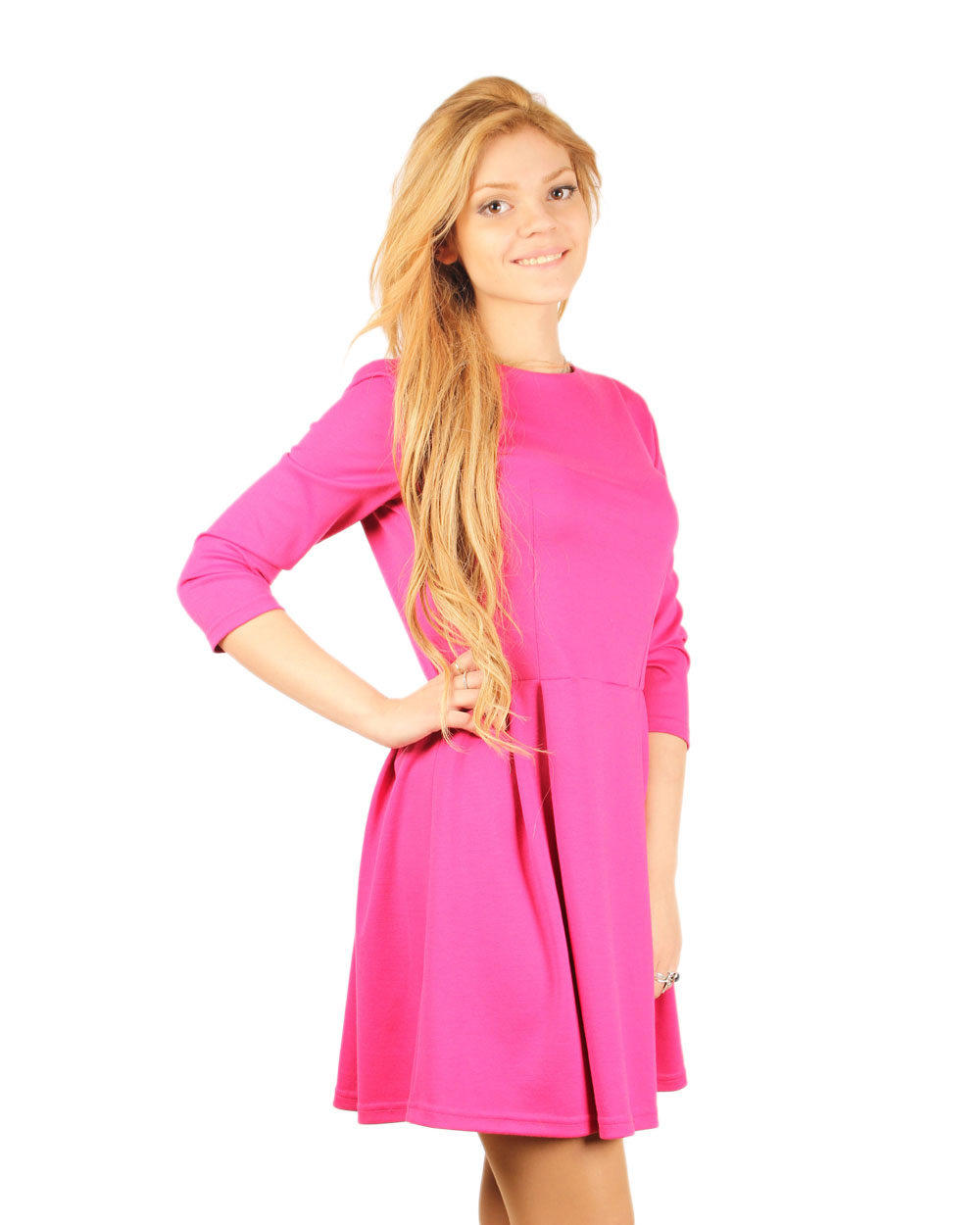 Прекрасное платье с рукавами на 3/4 и средней линией талии. Горловина округлой форми, цвет платья - розовый. Красивая модель на все случаи жизни.
