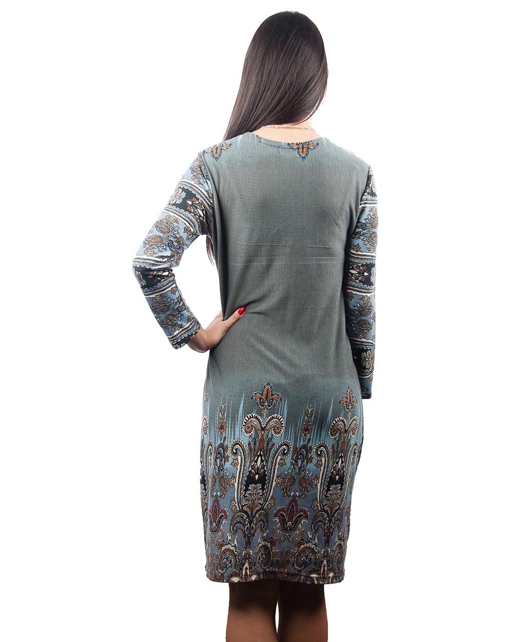 Элегантное платье в серых тонах выполнено из мягкой приятной для тела ткани. Абстрактный узор на рукавах и по подолу добавляет живости модели.