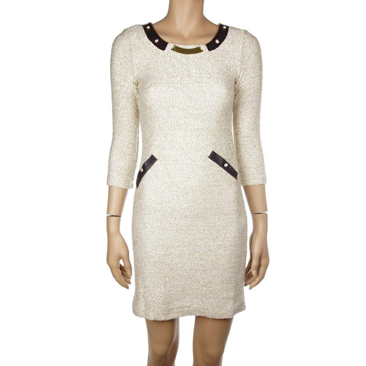 Описание: Оригинальное женское платье молочного цвета с черного цвета декорациями, с рукавом 3/4 и округлой горловиной. Декорировано искусственными камнями. Приталенное.