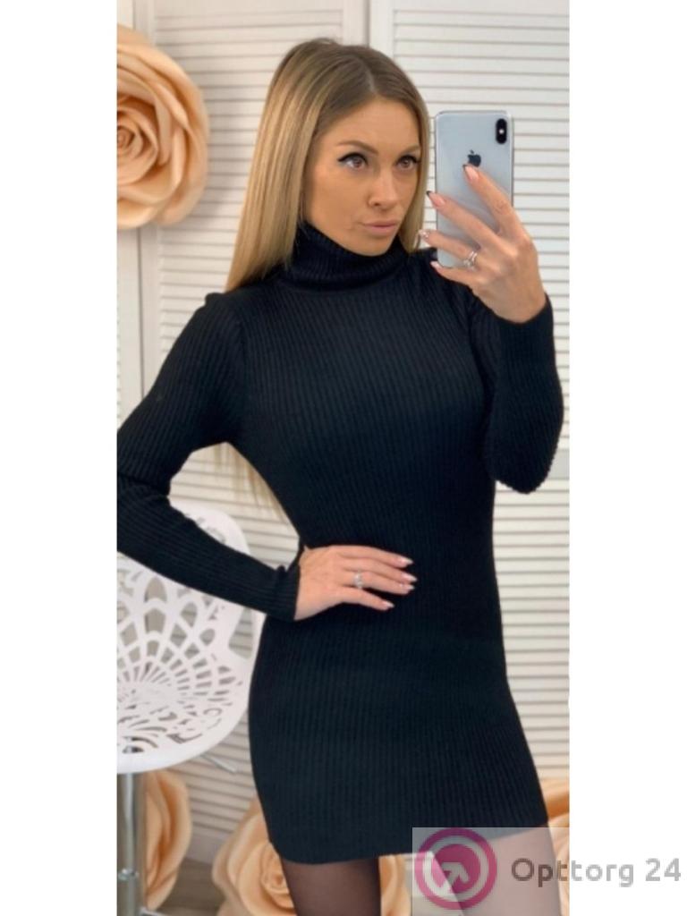 Приталенное женское платье черного цвета с длинными рукавами и высоким воротником, приталенный силуэт. Длина чуть выше колена. Очень молодежное и стильное.