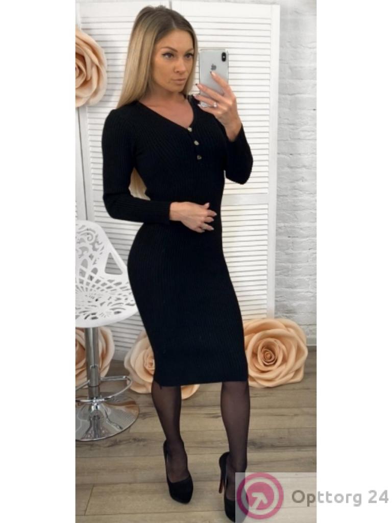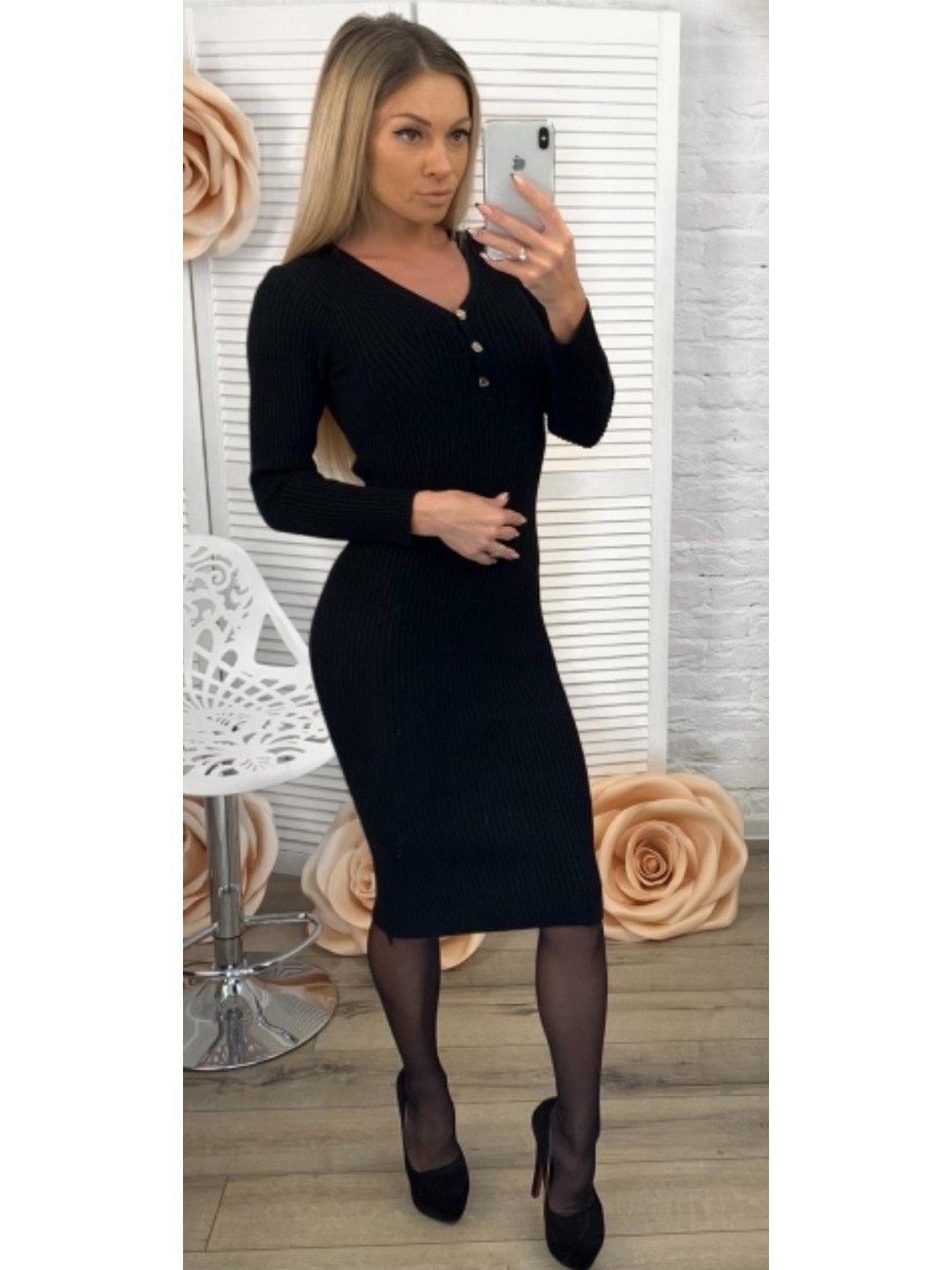 Черное вязаное платье с вырезом, длиной ниже колена. Декорировано пуговицами. Приталенная модель.