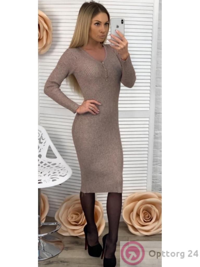 Женское вязаное платье коричневого цвета длиной до колена. Вырез на пуговицах.