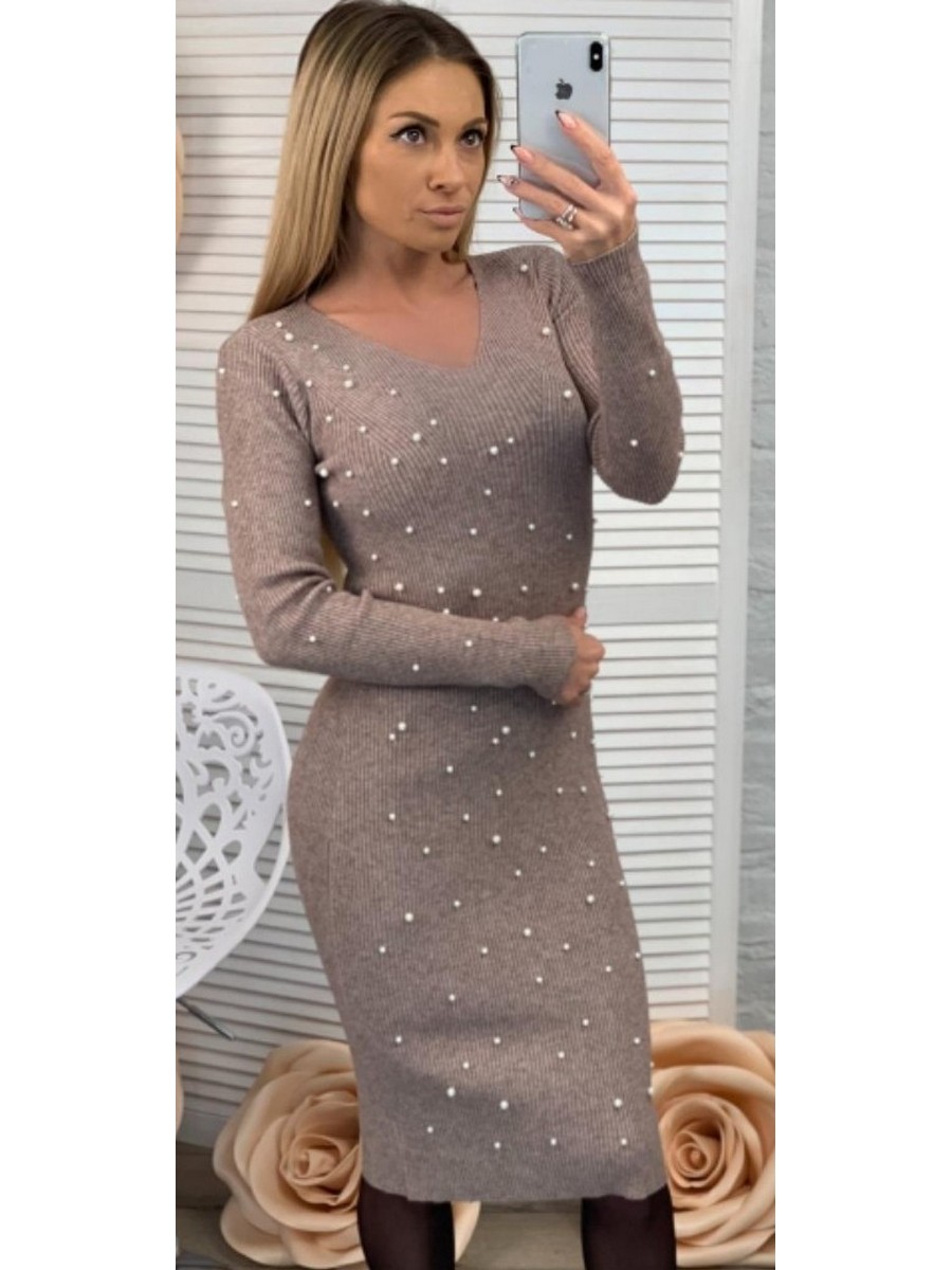 Модное вязаное платье цвета кофе с молоком. Длинные рукава и нашивка из бусин, имитирующих жемчуг. Длина изделия - до колена.