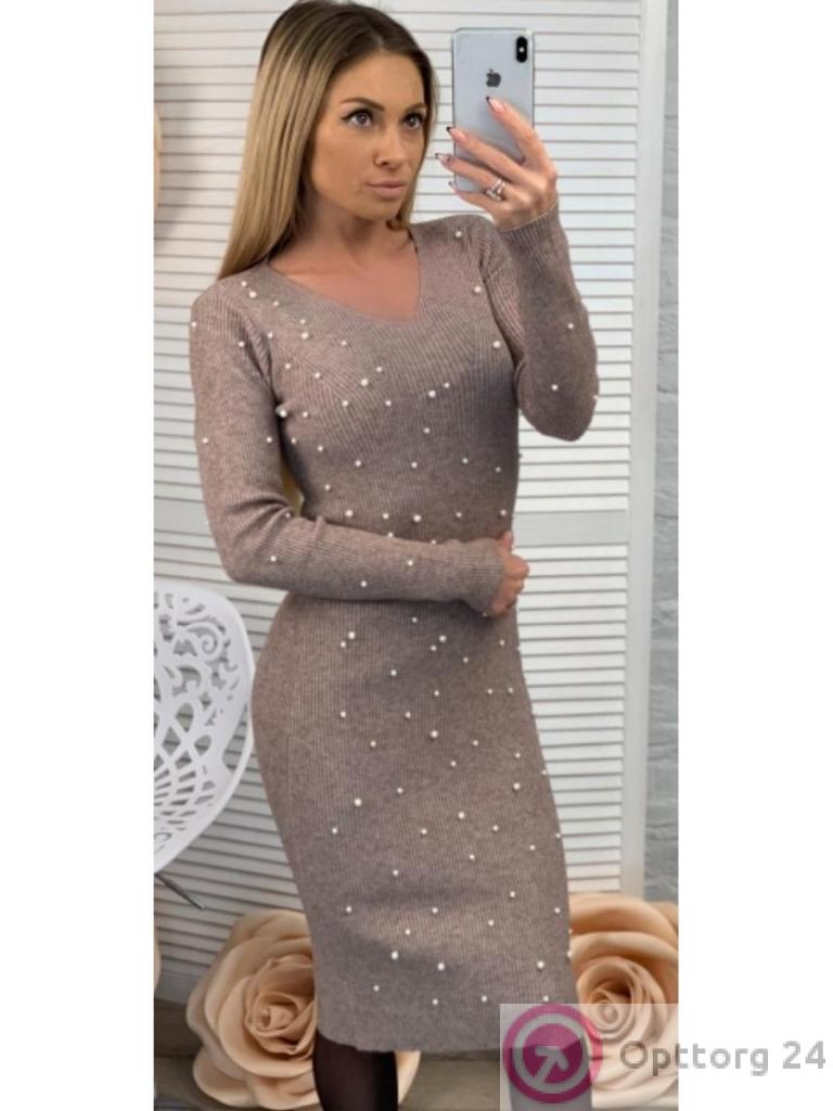 Платье женское вязаное коричневое с нашивкой из бусин оптом