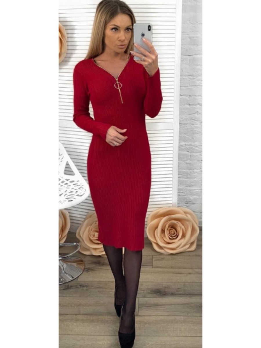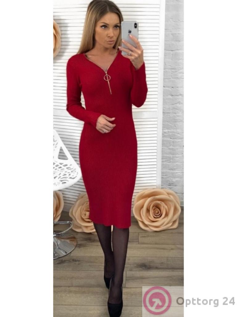 Яркое и стильное вязаное платье красного цвета с длинными рукавами. Вырез декорирован молнией. Длина до колена.