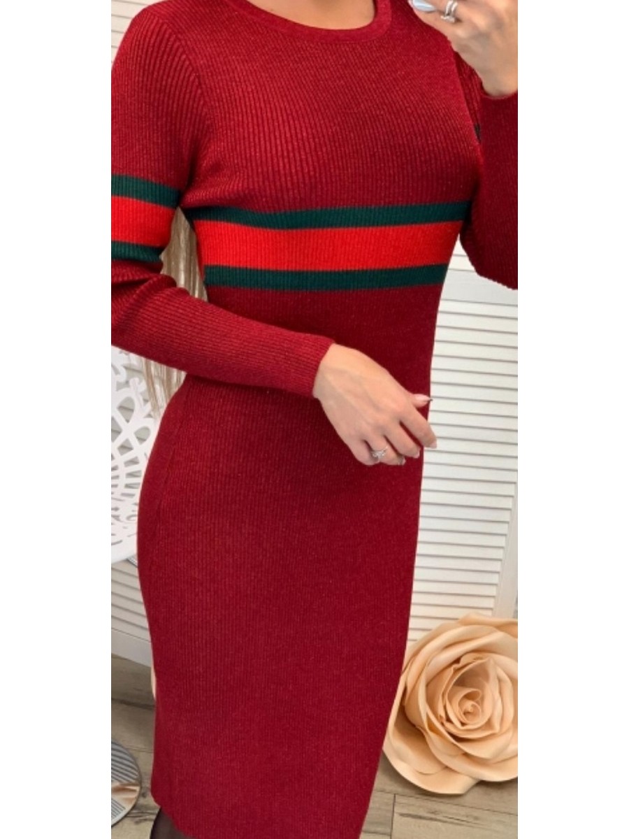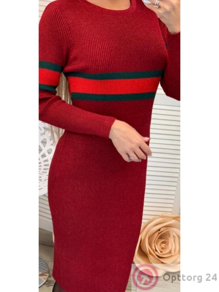 Модное вязаное платье красного цвета с полосой на груди. Длина ниже колена. Приталенная модель.